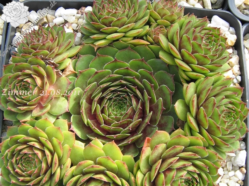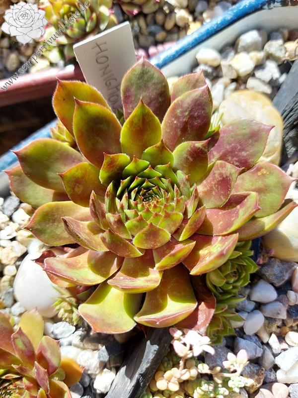 Ein Nachkomme aus einer Kreuzung eigener Hauswurz-Sämlinge, die wegen ihrer weißgelben Blütenfarbe ausgewählt und vermehrt wurden. Die Rosetten können einen Durchmesser von 9 cm erreichen und sind gut wüchsig. Im Frühjahr fällt die Pflanze durch das kräftig rote Zentrum mit wässrig grün-roten Blattenden auf. Das Besondere jedoch ist die warme Sommerfärbung, die auf dem Foto zu sehen ist und die sehr lange anhält. Sie erinnerte mich an frischen Blütenhonig der aus den Waben fließt. Die perfekte runde Form, mit dem leuchtend warmen Farben, scheinen wie ein Mond und so ergab sich der Name ‚Honigmond’. Ein sehr gesunder und wüchsiger Sempervivum. Leider nur wenige Rosetten!