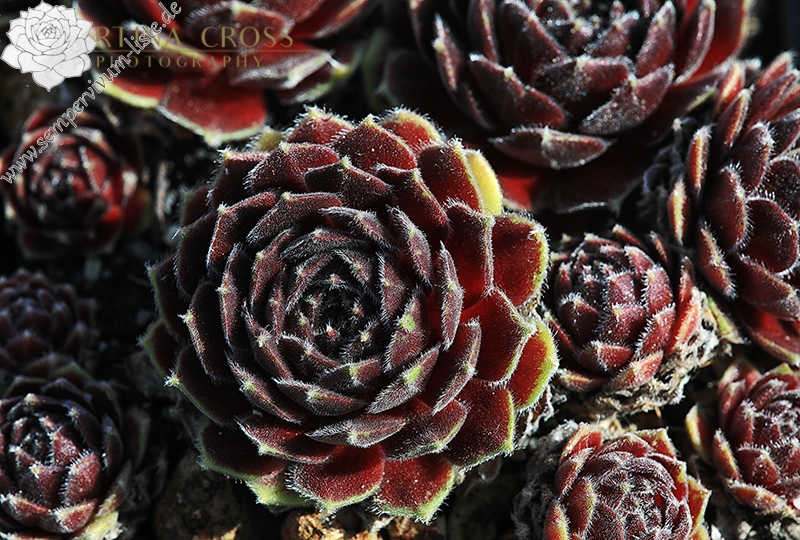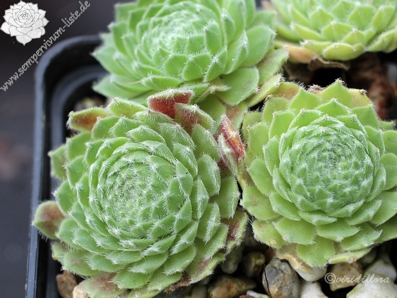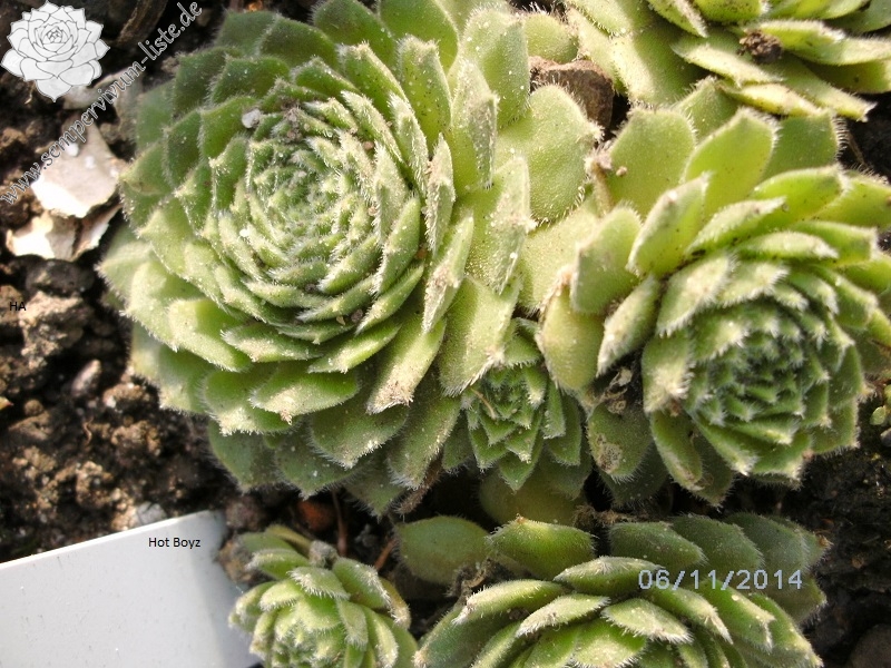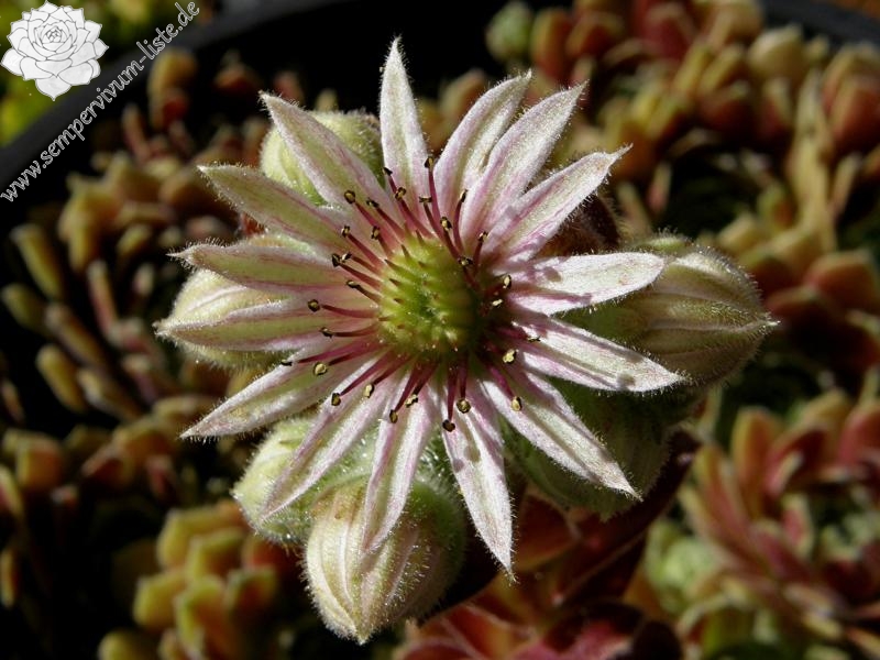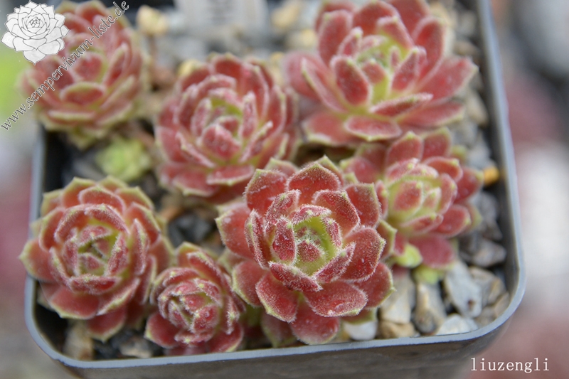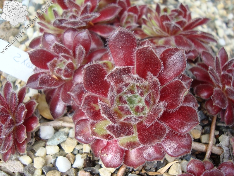 Ein Sämling von 'Aaron' der einen Durchmesser von 8 cm erreicht. Die flachen Rosetten zeigen sich schön geformt mit breiten Blättern, die eine starke weiße Behaarung besitzen. Im Frühjahr sind die Pflanzen dunkelrot, mit einem kleinen hell-grünen Zentrum. Zum Sommer hin werden die Rosetten von außen beigegrün und enden mit ganz hellgrünen Rosetten. Ein wahrer Verwandlungskünstler der zudem sehr wüchsig ist!
