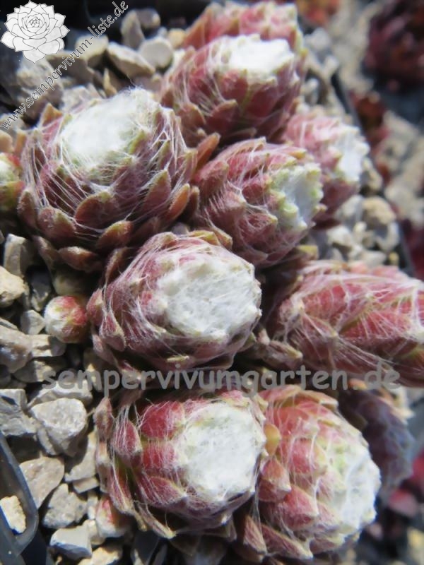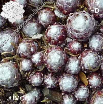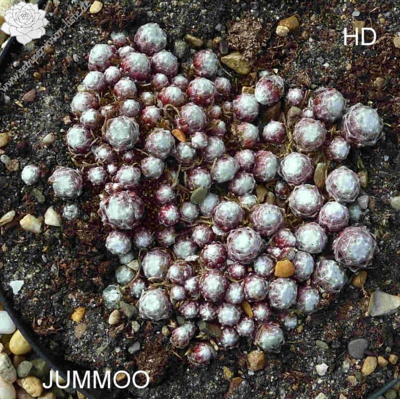 'Jummoo' ist ein Spinnweb-Hauswurz der im Zentrum kräftig weiß besponnen ist. Die äußeren Blätter sind nur leicht besponnen und zeigen eine dunkelrote Färbung. Wie bei fast allen Spinnweb-Typen ist das Frühjahr die schönste Zeit. Der Name gefällt mir auch!