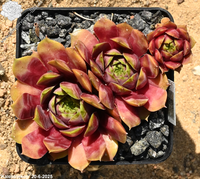 'Kaleidoskop' ist ein Sämling von 'Vasi Petru', es sind bullige Rosetten mit ca. 10 cm Durchmesser und sehr sukkulenten Blättern. Die geometrische Zeichnung der fest geschlossenen Rosettenmitte ist ihr Markenzeichen. Mitte Mai beginnen die Rosetten ihre Farbe aufzubauen, mit dicken magentafarbenen Blättern, die breite goldgelbe Spitzen tragen. Das obere Drittel der Blätter ist bläulich marmoriert und trägt deutliche Dornen. Ende Mai trägt sie ihre schönste Farbe, die Blattbasis in Kirschrot, dann folgt die stärker hervortretende bläuliche Marmorierung und endet in breiten goldenen Spitzen. Im Juni schließt sich die Rosettenmitte und die starke geometrische Maserung erinnert an ein Kaleidoskop. Im Hochsommer wird sie immer heller, die Maserung der Rosetten bleibt erhalten, aber verblasst dann immer mehr. Auch sehr heiße Sommer überstehen die robusten Rosetten sehr gut und vermehrungsfreudig sind sie auch.