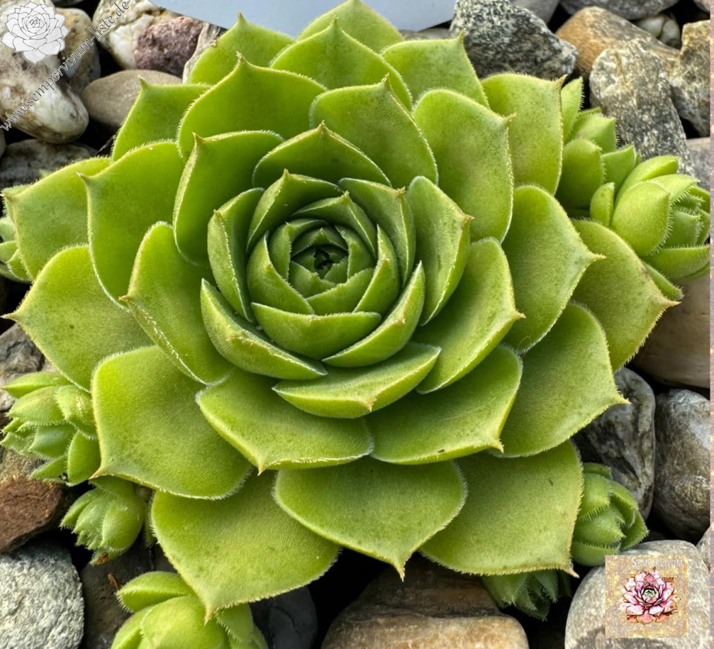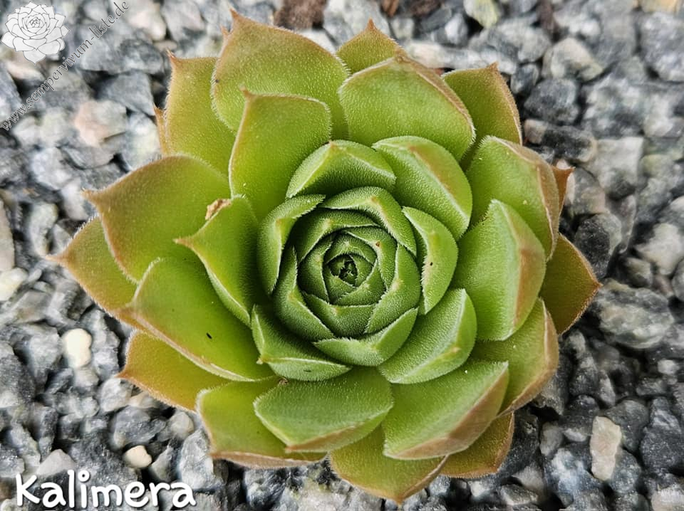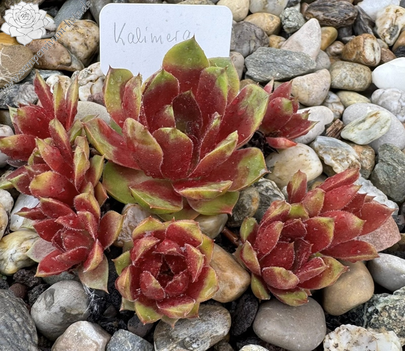 Kalimera" habe ich wegen ihrer breiten und sehr sukkulenten Blätter aus den vielen Sämlingen von 'Gelber Stern' ausgelesen. Sie strahlt in leuchtenden Farben und hat sich seit ihrem ersten Jahr nicht verändert, im Gegenteil, ihre Farben sind noch intensiver geworden. Ihr Herz prunkt mit blutroten, leicht samtigen Blättern. Sie sind mit spitzen Dornen bewehrt, die zarte Bewimperung ist kaum zu erkennen. Bei den folgenden Blattreihen tragen die Spitzen im oberen Drittel hellgrüne Wellen. Die äußersten Blattreihen sind hellgrün, aber von der Basis her bis fast zur Mitte immer noch blutrot. Die Rosetten werden ca. 8 cm groß