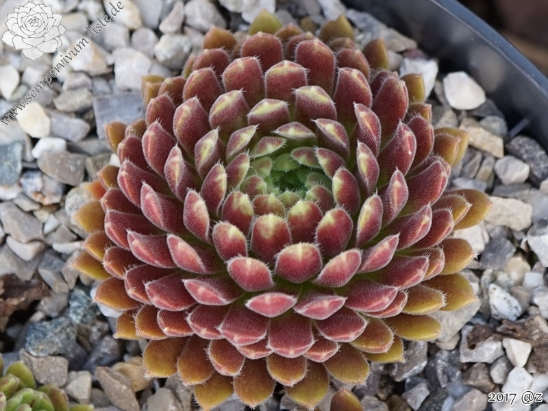 Rosetten bis 4 cm, Blätter oval, kurz bespitzt, Herz hellgrün, Rest weinrot, bewimpert