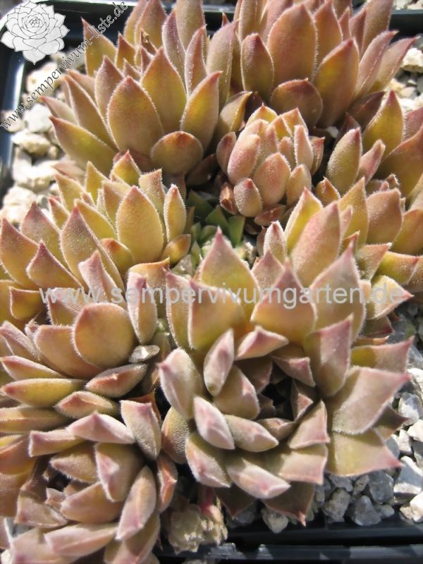 Rosetten 3-4 cm, braunrosa, bewimpert, viele Ausläufer