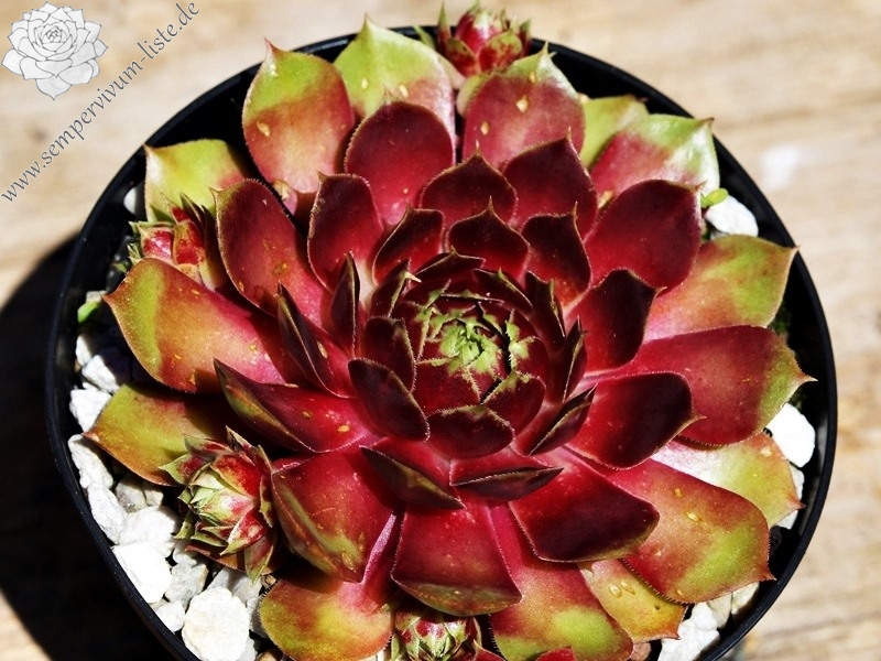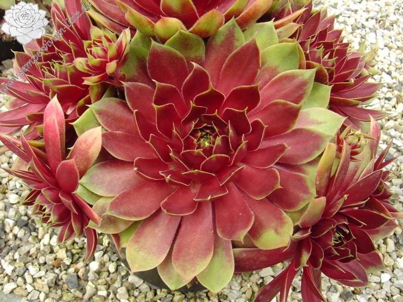 Eine königliche Sorte aus Großbritannien. Im Frühjahr erscheinen die größeren Rosetten in prächtigem Rot mit hellgrünen Blattenden. Zum Sommer ändert sich der Ton zu Rosarot mit gelblichgrünen Spitzen.