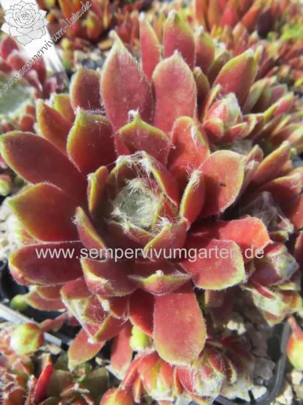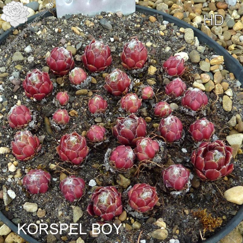 Sempervivum 'Korspel Boy' ist eine mittelgroße Züchtung die auch Spinnwebblut besitzt. Die Blattspitzen sind leicht bewollt.