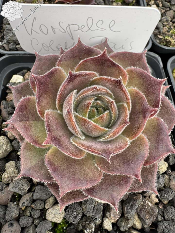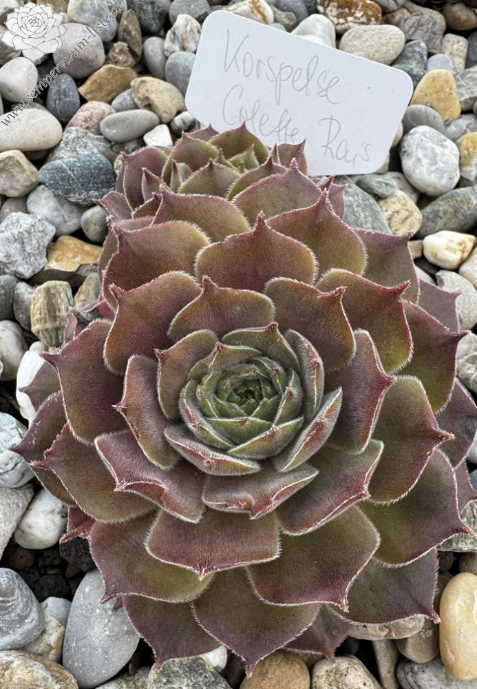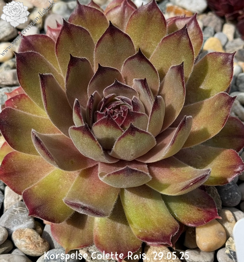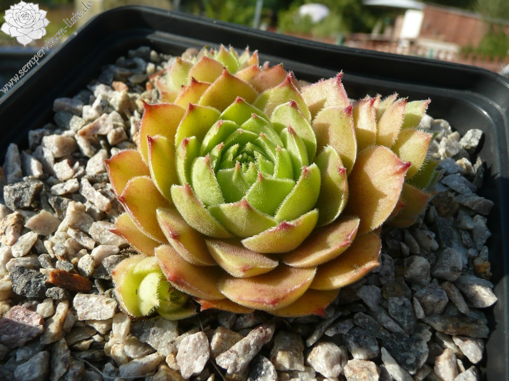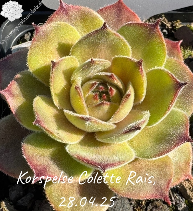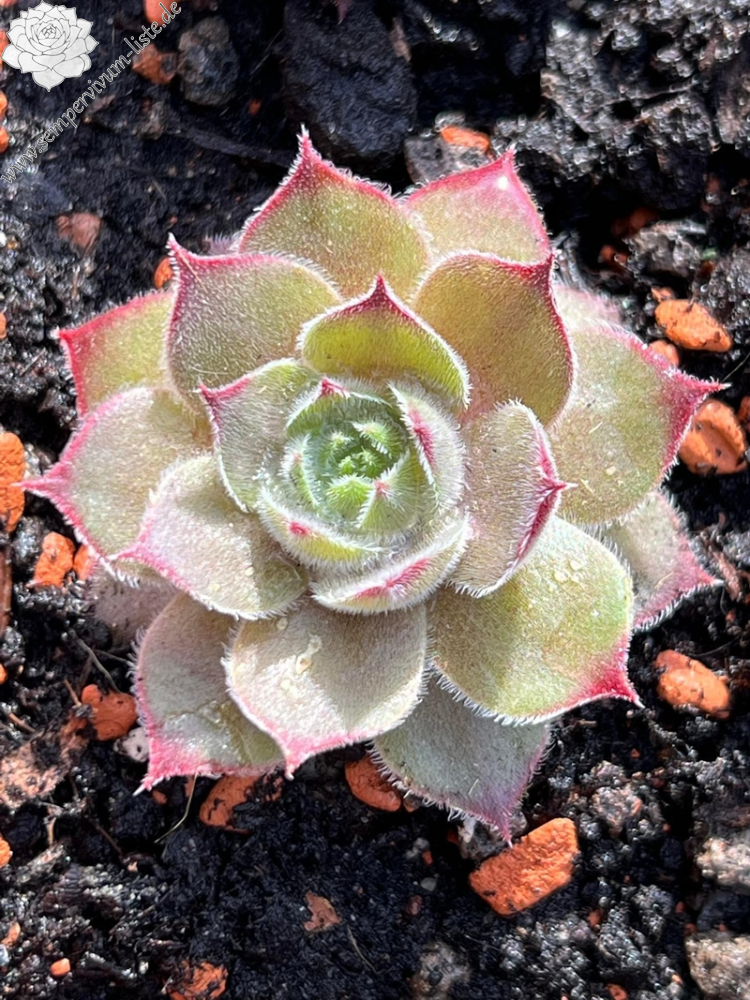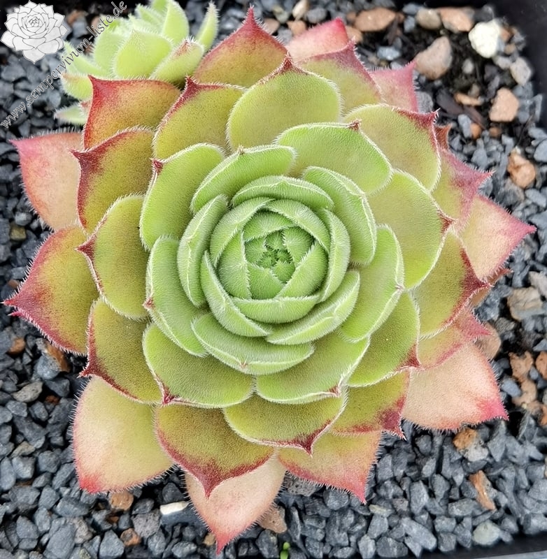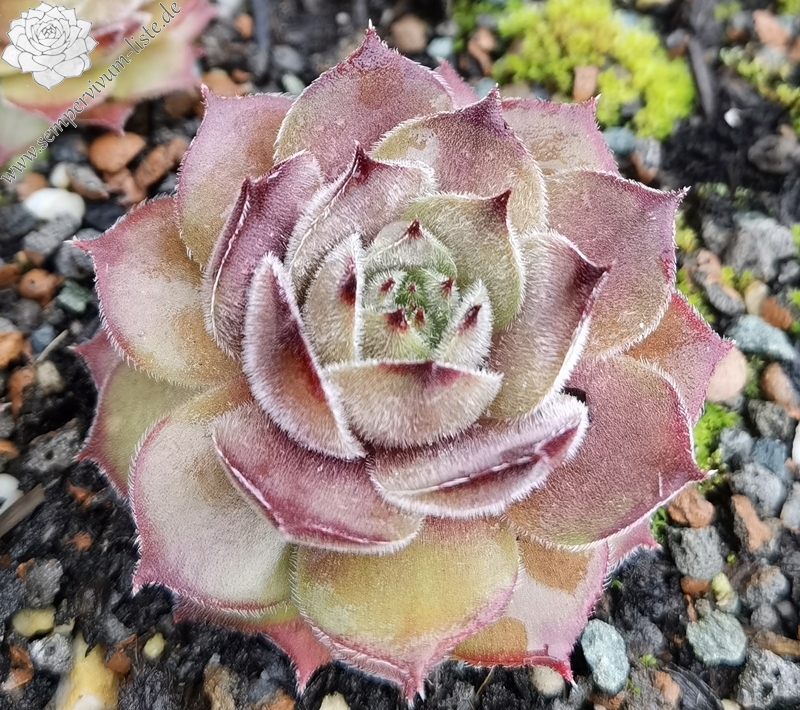 Rosetten bis 4 cm, Blätter eiförmig, kurz bespitzt, Mischfarben pastellrosa - pastellgelb, Spitzen dunkelbraun, bewimpert