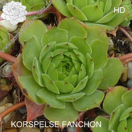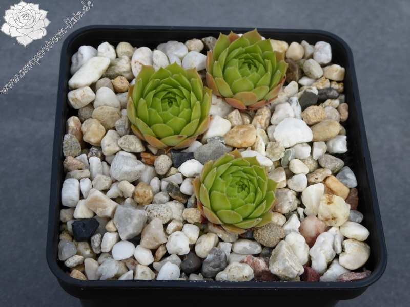 Rosetten bis 6 cm, Blätter rundlich, kurz bespitzt, lindgrün, Spitzen etwas braun, Ableger an langen rötlichen Stolonen