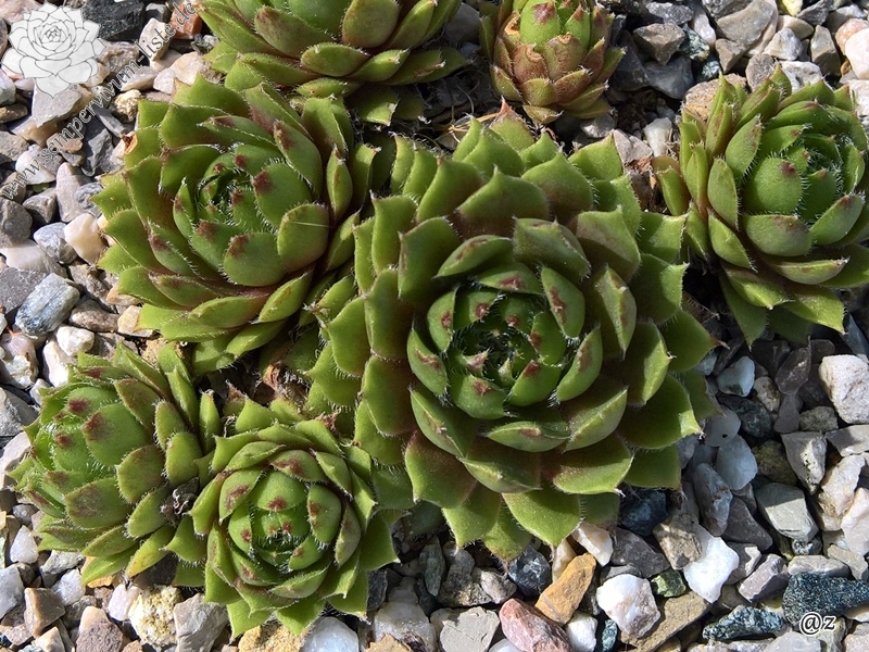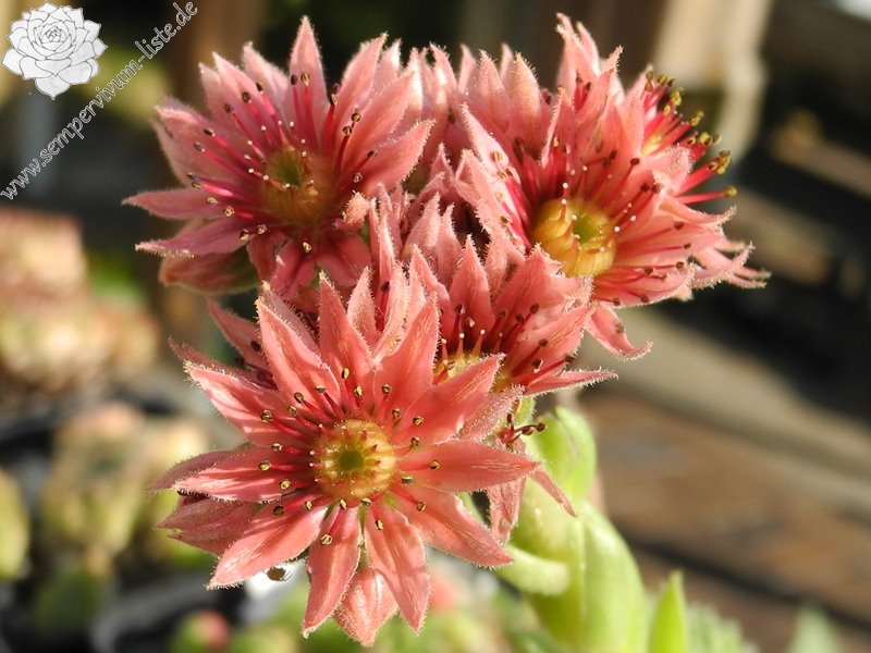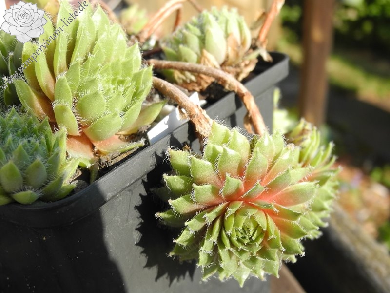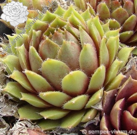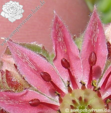 Die Blätter besitzen auffallend lange Randwimpern. Sie formen Rosetten mittlerer Größe von bis zu acht Zentimetern und haben bereits im ersten Jahr großen Zuwachs. Unser Zufallssämling zeigt insbesondere im Sommer eine ungewöhnliche Färbung. In manchen Jahren hat er im Juli eine cremegrün-gelbe Tönung. Auch die rosafarbenen Blütenblätter sind eine Besonderheit - sie sind jeweilis zur Mitte leicht weiß gestreift.