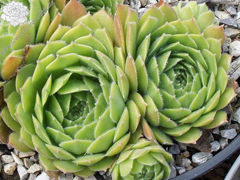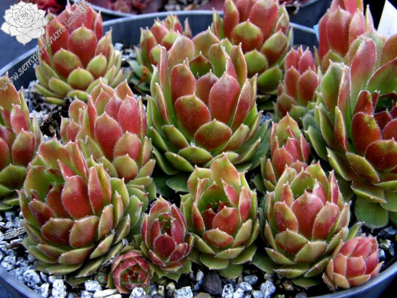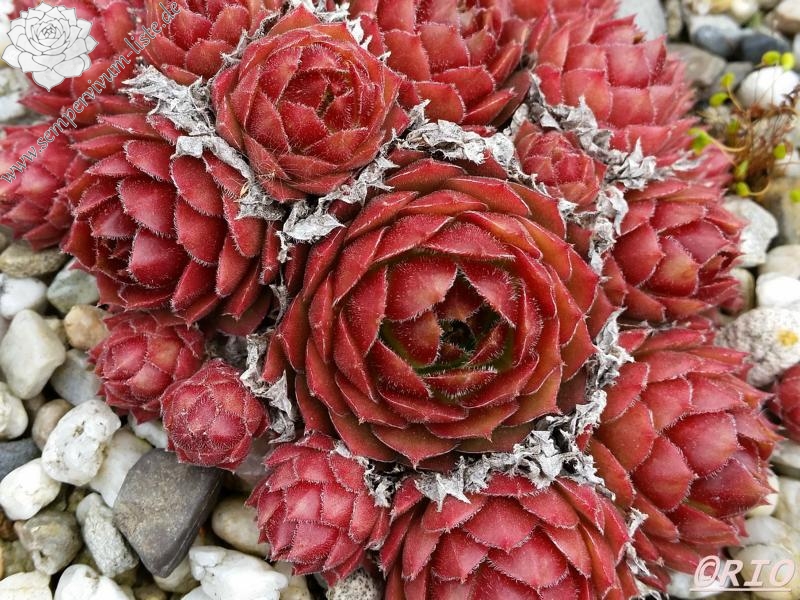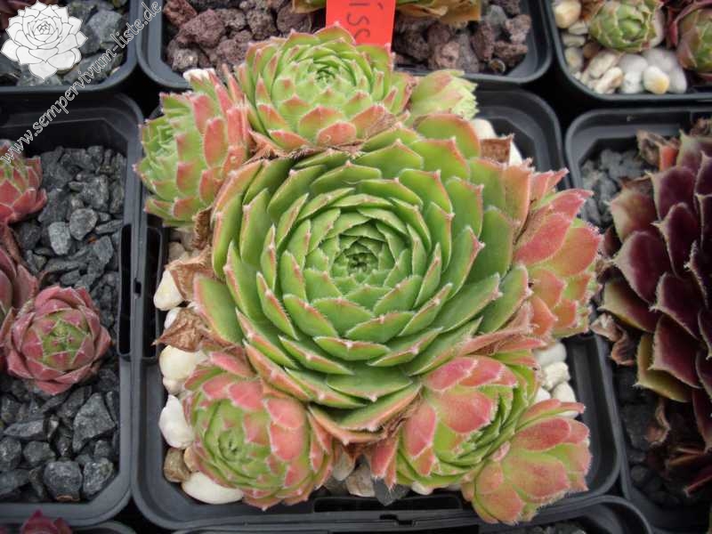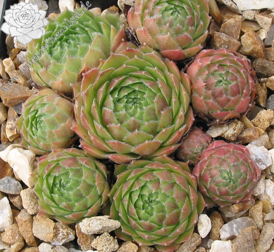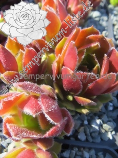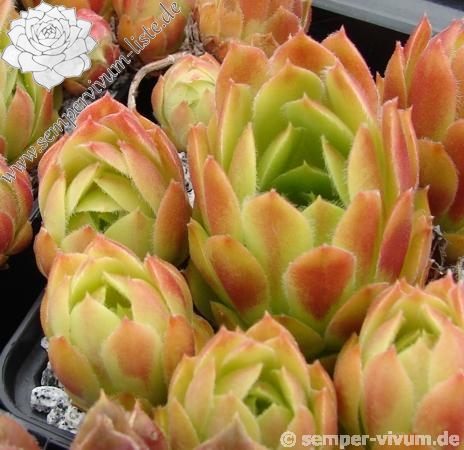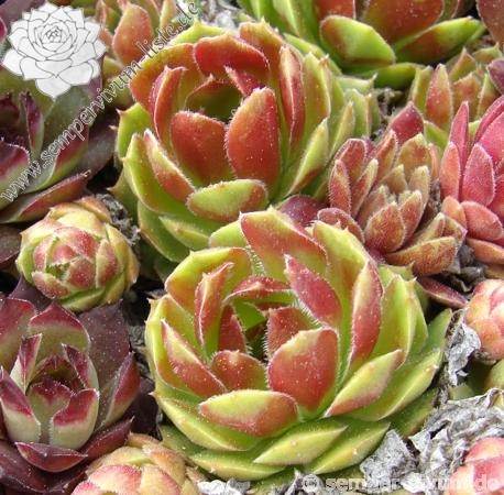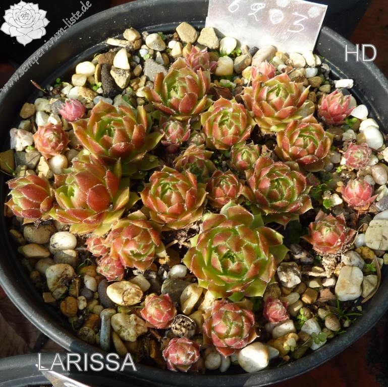 Sempervivum 'Larissa' ist eine kleinere, ganz bunt wirkende Kreuzung. Die Rosetten sind kugelig geformt und sprossen willig. Die kurzen Blätter sind leicht behaart.