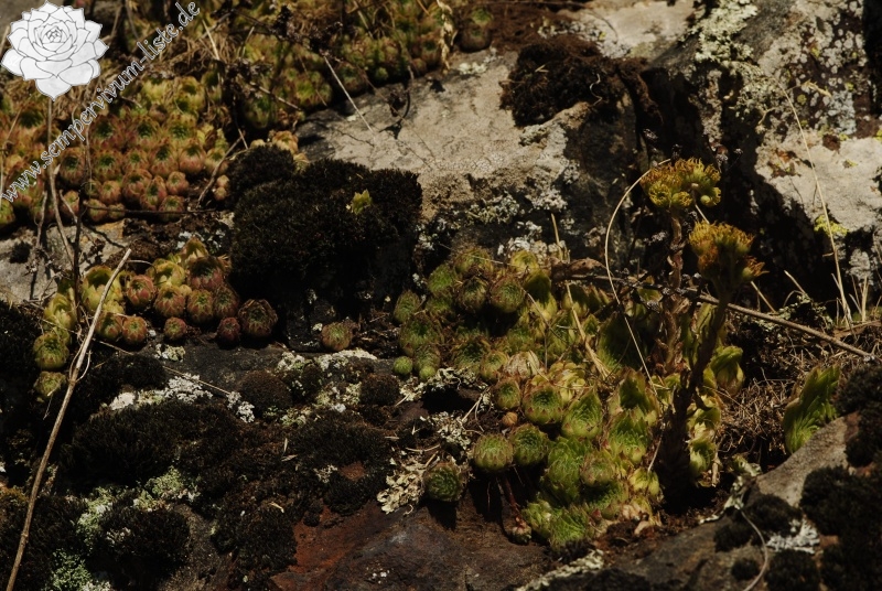 Beschreibung der Pflanzen: An dem Naturstandort wächst eine riesengroße Menge der Rosetten von Sempervivum leucanthum, die Rosetten wachsen da oft in den Kolonien oder in den kleinen Gruppen, ich habe da Rosetten aller Größen beobachtet.