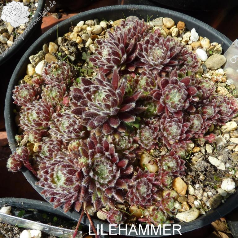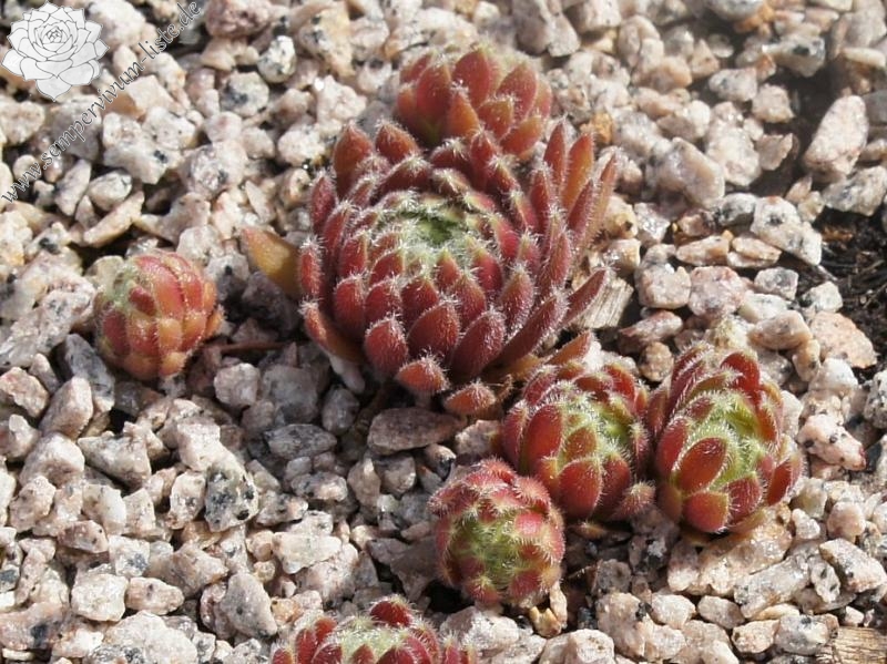 Die kleinen, roten Rosetten sitzen ganz eng zusammen und bilden dichte Polster. Die weiße Behaarung rundet das Bild schön ab. Die intensive Färbung bleibt auch gut im Sommer erhalten. Ein kleines Schmuckstück!