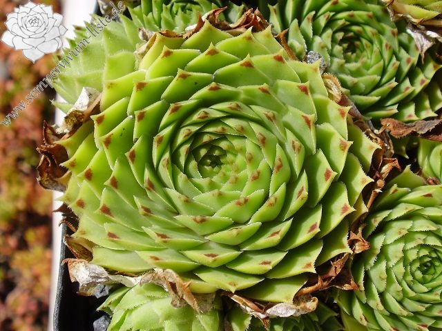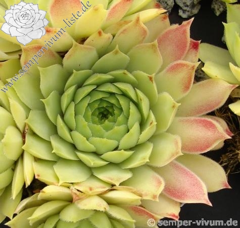 Ein sehr wüchsige Klon von Sempervivum calcareum, der aus den französischen Alpen stammt und von Peter Mitchell verbreitet wurde. In den Sommermonaten verschwinden oft die roten Blattspitzen ganz!