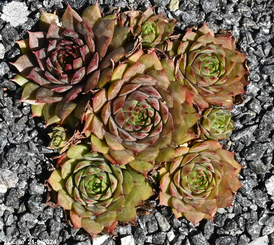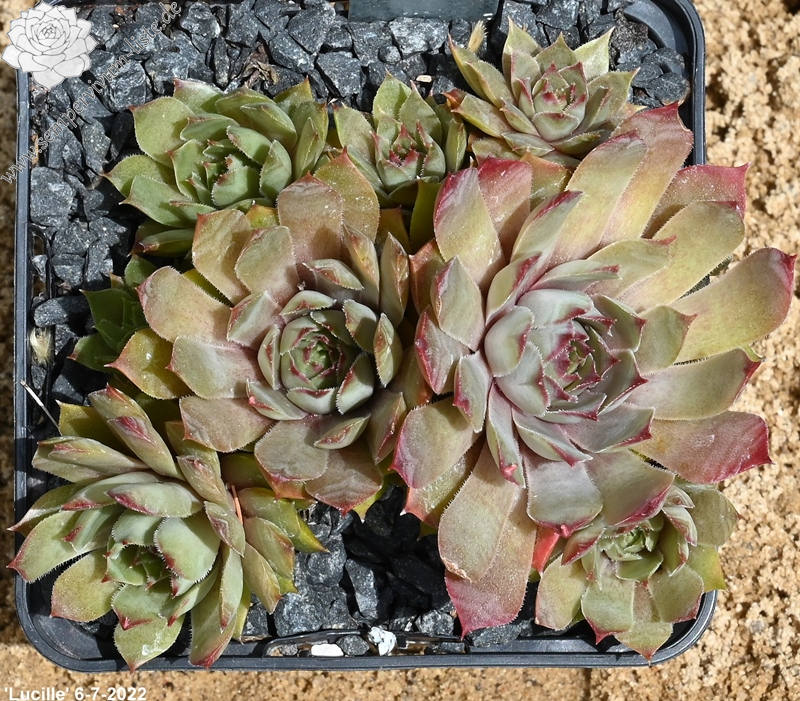 'Lucille' has pale green, medium size rosettes to 4” across with cream watermarks and red tips. 'Lucille' is our seed grown selection.