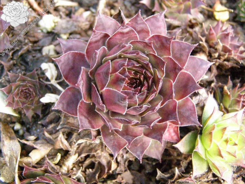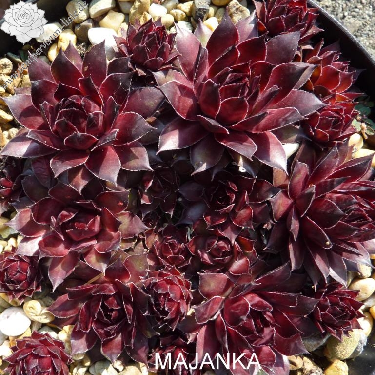 Die Hybride 'Majanka' formt mittelgroße bis große Rosetten in violettbraunen Tönen. Vom Aussehen könnte Sie vor allem zu dieser Zeit als größere Schwester von 'Dark Beauty' beschrieben werden. Bis zum Herbst wechselt die Färbung zu Olivgrün. Das stark gespitzte Laub ist dann rotbraun gerandet.
