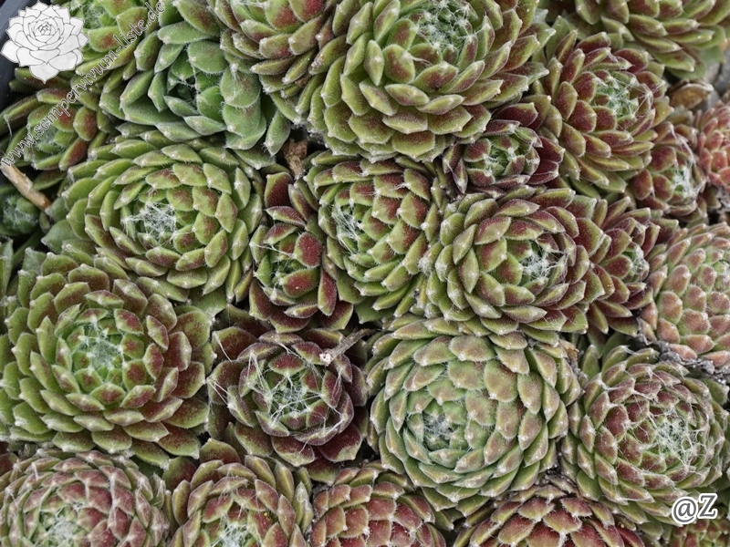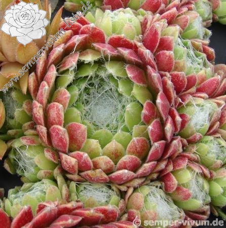Die Rosetten sind relativ klein und formen dichte Polster. Zum Sommeranfang ist 'Makora's' sehr auffallend durch den leuchtend roten Ring, der optisch durch die tolle Färbung auf der Rückseite der äußeren Laubblätter entsteht. Eine sehr kompakte Sorte aus der Gruppe der Spinnwebhauswurzen.