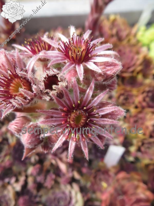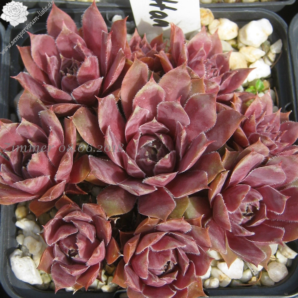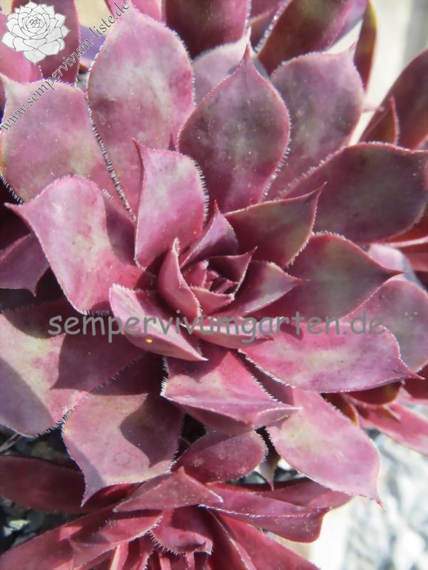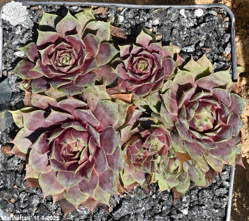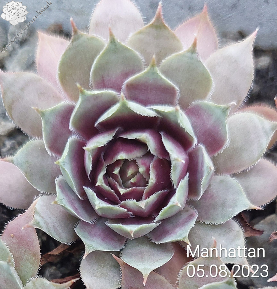 Sempervivum 'Manhattan' zeigt kräftige Farben, besitzt jedoch eine auffallend kühle Gesamtwirkung. Die Farben sind sehr harmonisch und lassen sich gut in jede Pflanzung einbringen. Im Frühjahr sind die Rosetten anfangs sehr kühl, lila gefärbt und sobald die Temperaturen steigen, schmückt sich das Zentrum mit leuchtend purpurnen Farben, die sich dann unregelmäßig über die ganze Pflanze verteilen. Im Sommer werden die Blattenden immer heller und das Zentrum färbt sich kräftig Lila und erhält eine sehr dunkle Wirkung. Die Rosetten besitzen eine sehr flache, offene Wirkung und erreichen einen Durchmesser von etwa 10 cm. Sie sind unempfindlich und kommen auch mit sehr heißen, trockenen Sommer gut zurecht, ohne dass die Farben leiden. Es handelt sich um eine wüchsige Pflanze, die schnell dichte Polster bilden kann. Die Blüten erscheinen nur selten und sitzen ganz dicht zusammen auf kleinen Blütenbällen. Die Blütenblätter sind sehr schmal, mit hellen Rändern. Eine robuste Pflanze die mir sofort gefallen hat!