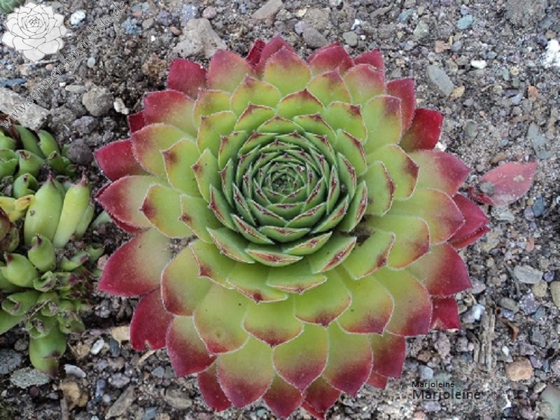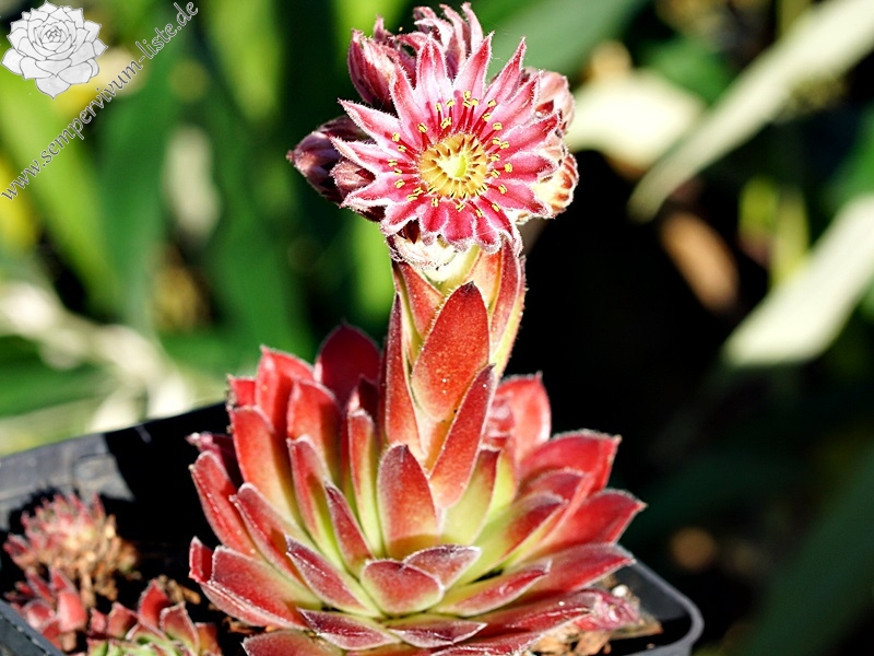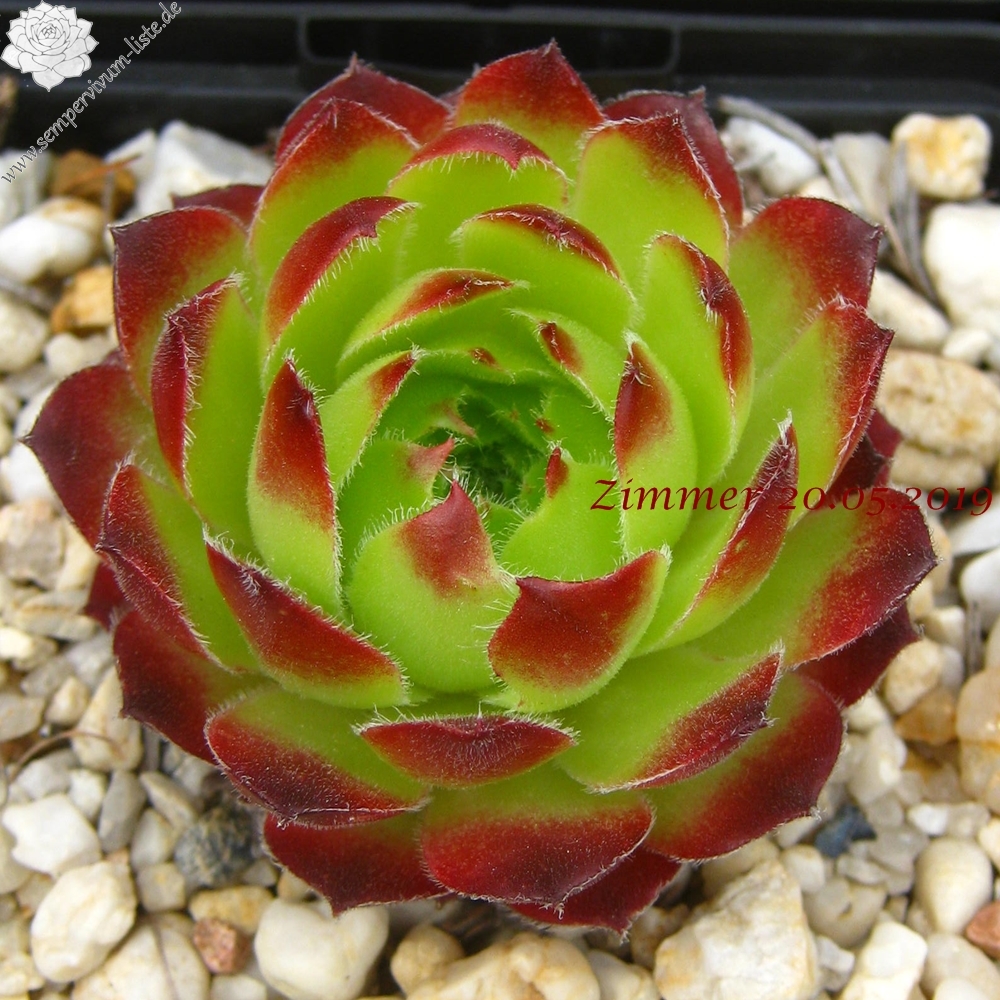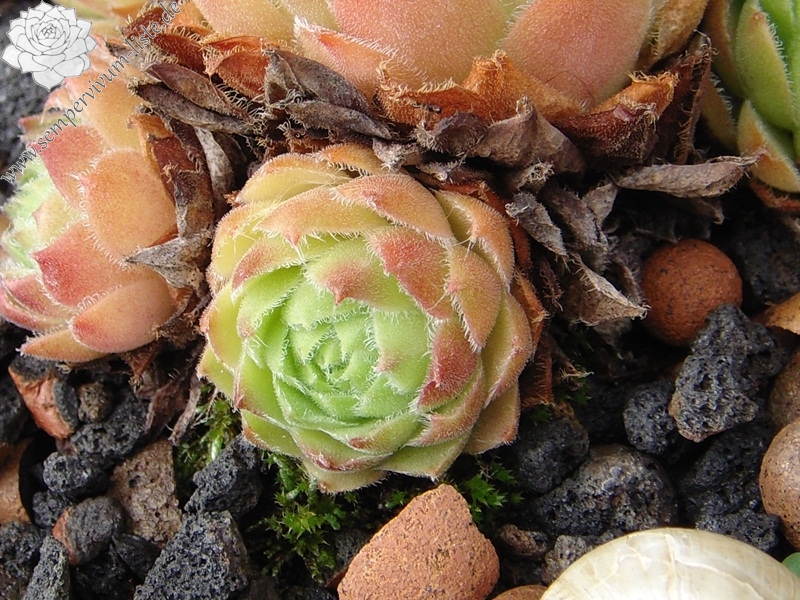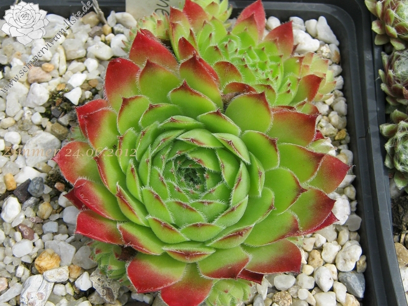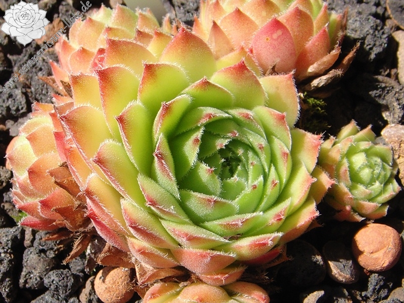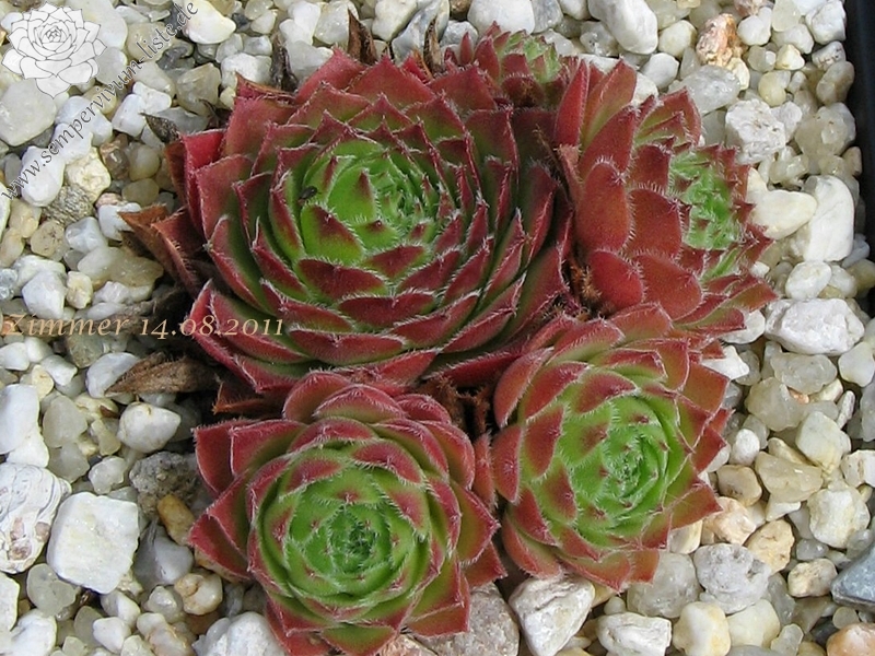 Rosetten bis 5 cm, Blätter oval, kurz bespitzt, gelbgrün, Spitzen braunrot