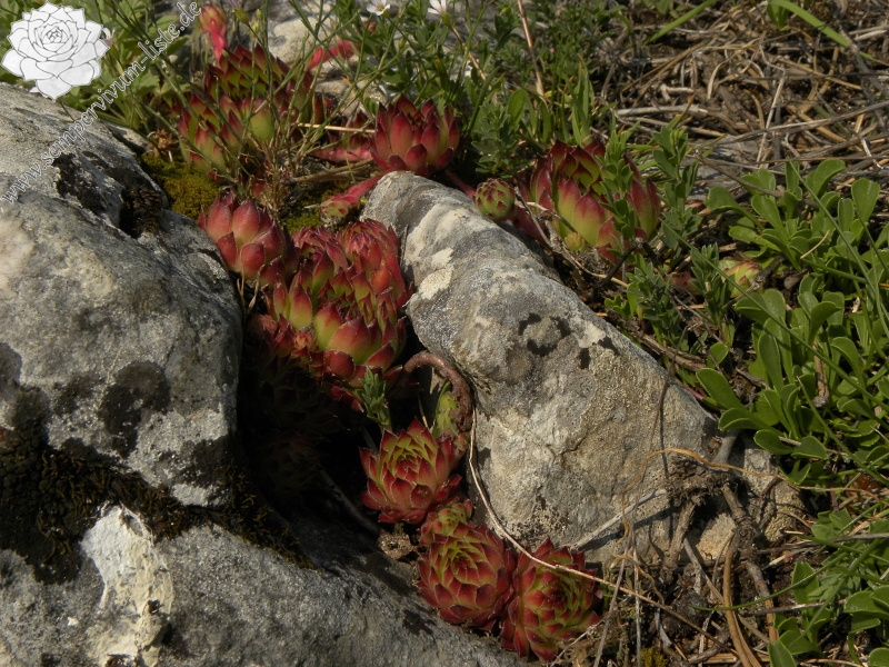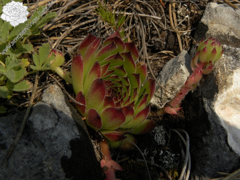 Zu den Pflanzen: Die Rosetten haben Gruppen gebildet. Einige Gruppen waren klein mit etwa 10 Rosetten, nächste waren ausgedehnt mit der Menge um 30 (manchmal mehr) Rosetten. Die meisten Rosetten waren in gutem Zustand. Ich habe ein paar Rosetten gesehen, die durch Endophyllum sempervivi angesteckt waren. Alle Rosetten an dem Standort hatten behaarte Rosettenblätter. Die Rosettenblätter waren dicht behaart, die Behaarung war kurz. Die Behaarung bleibt in der Kultur und ist auch kurz. Fast alle Rosetten haben die Spitzen der Rosettenblätter rot gefärbt. Die Rosetten, die nicht im Schatten im Gras gewachsen sind, waren ganz rot gefärbt. Einige Rosetten hatten die Ausläufer. Die Ausläufer waren etwa um 4 cm lang. Die Blüten habe ich an diesem Standort nicht beobachtet.