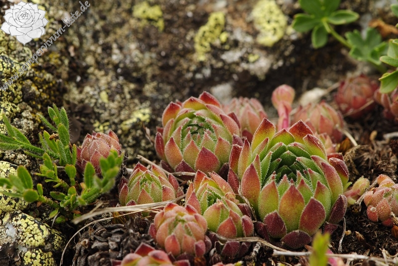 Zu den Pflanzen: Die Rosetten waren schön grün oder dunkelgrün gefärbt. Die Spitzen der Rosettenblätter und bei einigen Rosetten auch die äußeren Rosettenblätter waren lila oder dunkelrot gefärbt. Die Ausläufer waren rosa gefärbt, sie waren ziemlich lang mit den kleinen Blättern. Die Rosettenblätter waren dicht drüsig behaart. Ich glaube, dass es sich um Sempervivum macedonicum handelt. Bei diesen Pflanzen bin ich ziemlich sicher.
