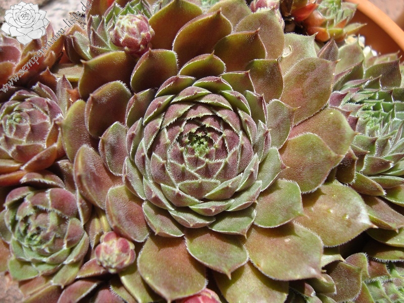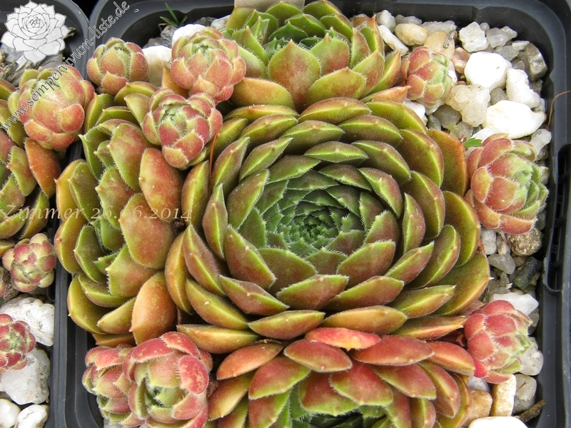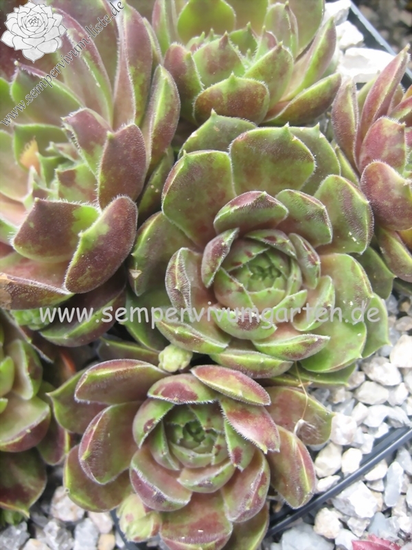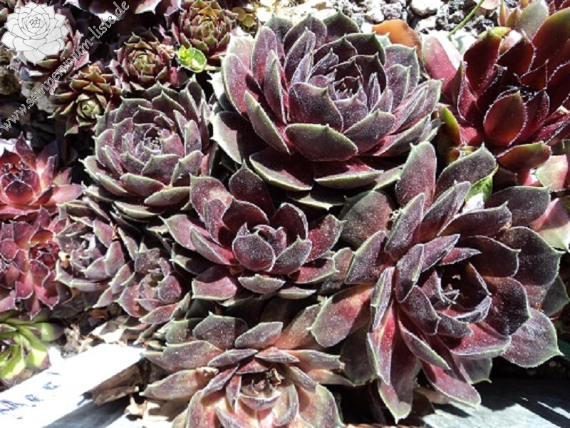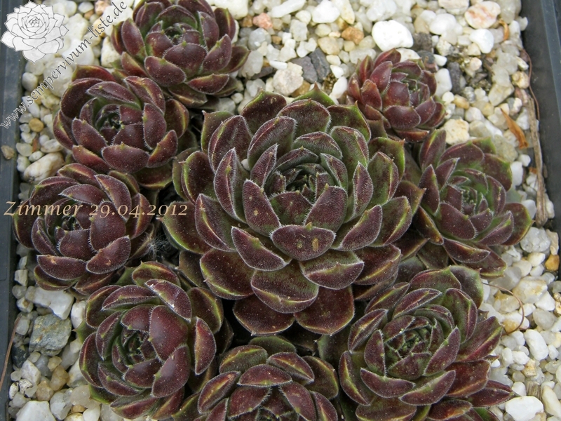Mittelgroße, samtige Rosetten mit dunkler Färbung. Im Frühling lila-rot, zum Sommer hin grün-rotes Laub mit grünen Blatträndern. Gut wüchsig!