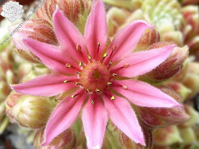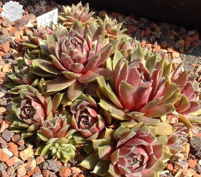 geschlossene Rosetten bis 6 cm Größe, Mischfarbe oliv grün, Blätter außen rosa rot, Blattränder und Spitzen schön bewimpert, ein Elternteil 'Monases', benannt nach Gärtnermeister Bruno Diehm