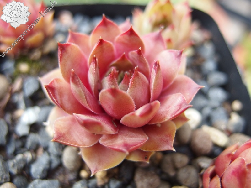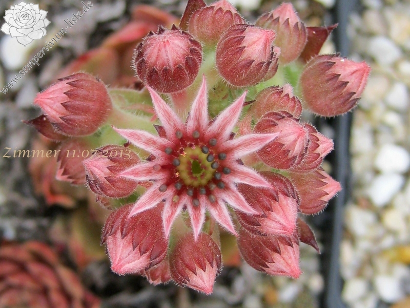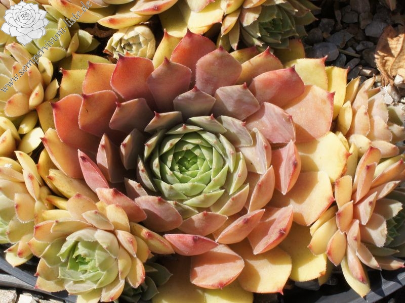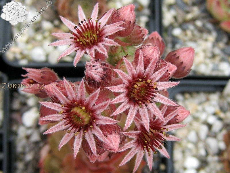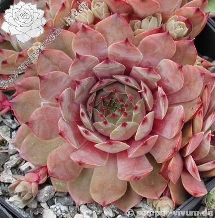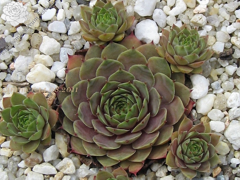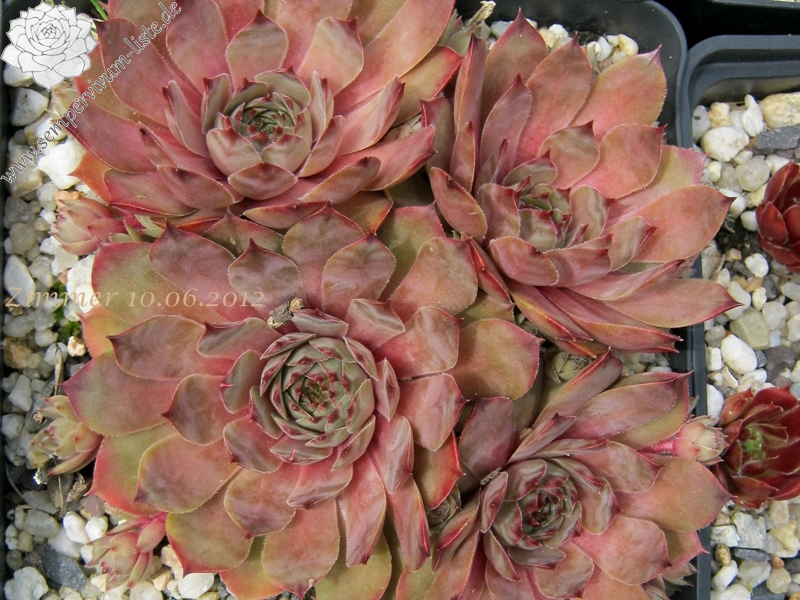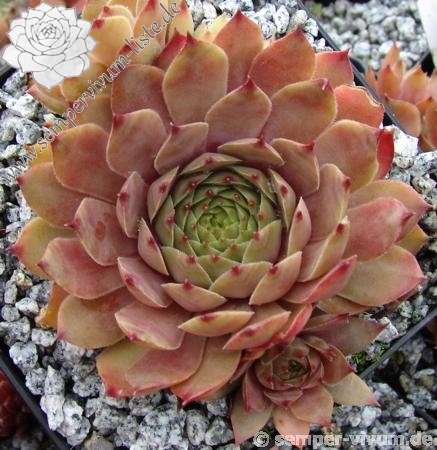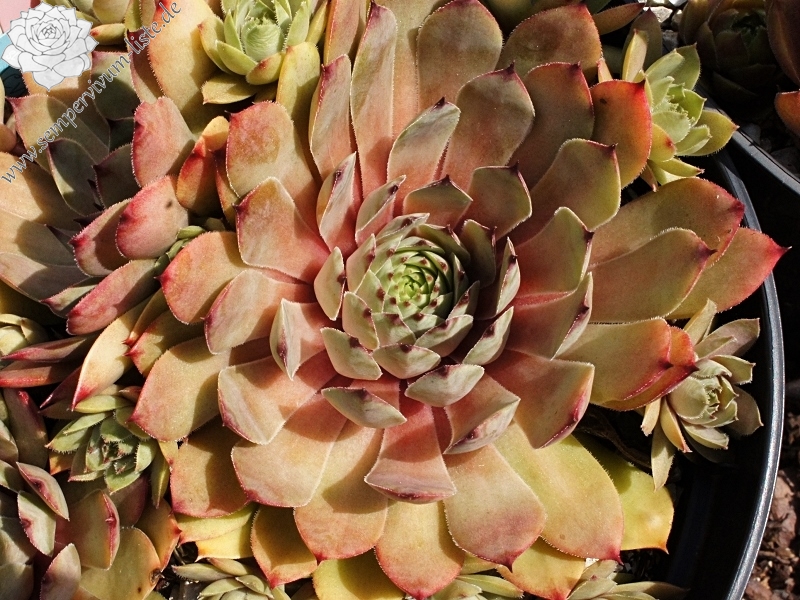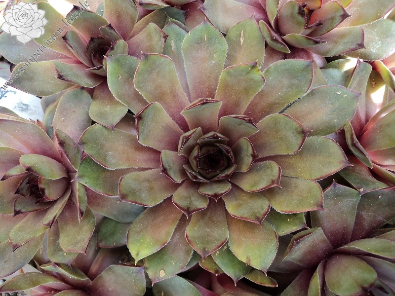 Die terracottafarbenen Rosetten erreichen einen O von 5 - 6 cm. Die Blattenden sind dunkler gefärbt.