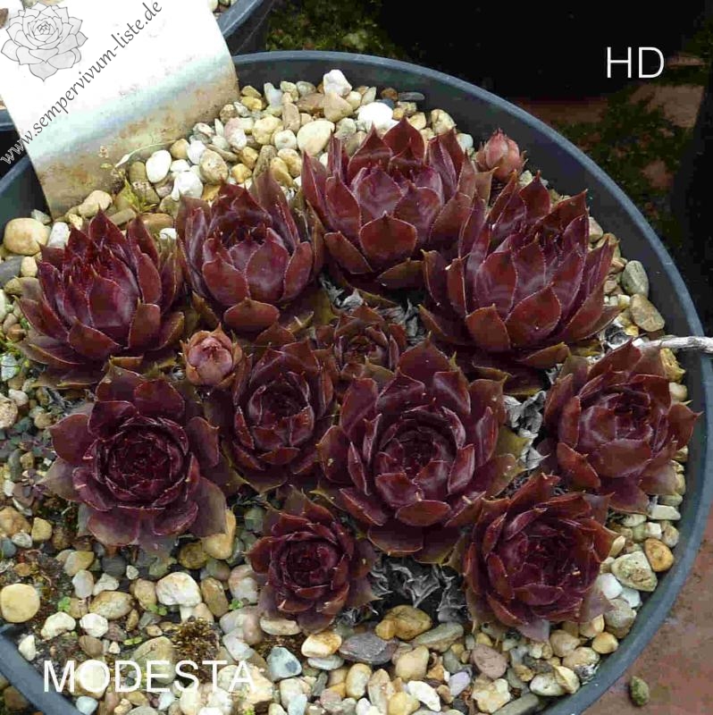 Die belgische Züchtung wurde bereits vor über 25 Jahren benannt und ist bis heute kaum bekannt. Durch ihre ungewöhnliche Färbung hat sie jedoch eine weite Verbreitung verdient. 'Modesta' formt größere Rosetten in verschiedener Farbmixtur aus Karamell und Violett.