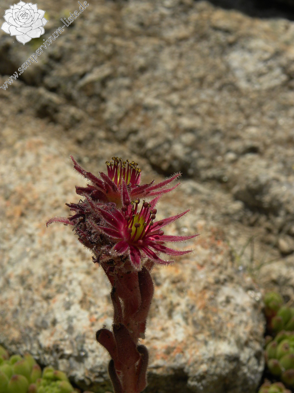 Zu den Pflanzen: Die Rosetten waren gesund, aber klein. Die größten Rosetten hatten etwa 2,5 cm im Durchmesser. Ich habe am Standort wenige neuen Ausläufer beobachtet. Trotzdem habe ich da eine blühende Rosette gefunden. Die Blüten waren ein bisschen dunkler als gewöhnlich. Diese Eigenschaft ist beständig, die dunklen Blüten haben die Rosetten auch in Kultur.