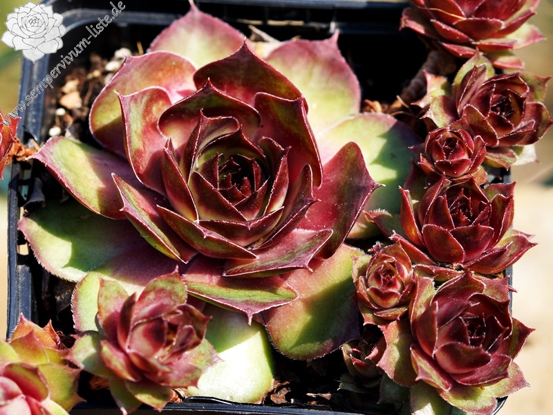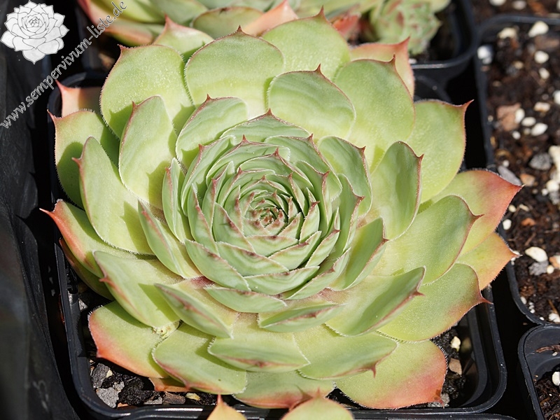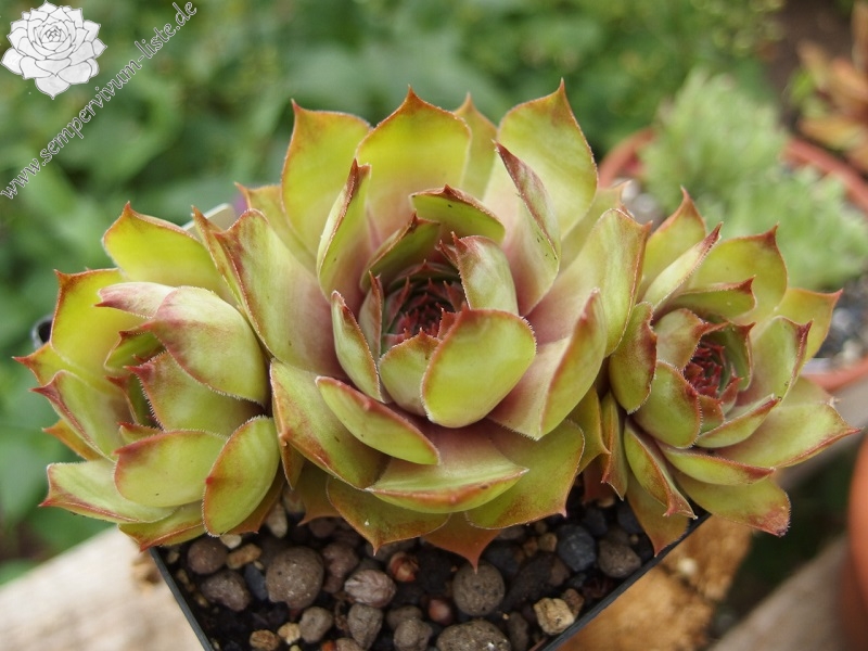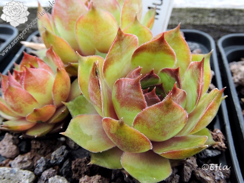 Rosetten bis 5 cm, Blätter oval - rundlich, kurz bespitzt, gelbgrün mit rötlichen Spitzen