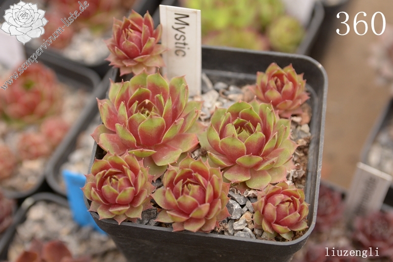Der Brite aus den 80er Jahren stammt aus der Zuchtarbeit von David Ford. 'Mystic' formt mittelgroße Rosetten in glühend orangeroter Frühjahsfärbung. Zum Sommer wandeln sich die Farben in ein leuchtendes Grün. Die Blattspitzen sind während dieser Jahreszeit in ein pfirsichfarbenes Rosa getaucht.