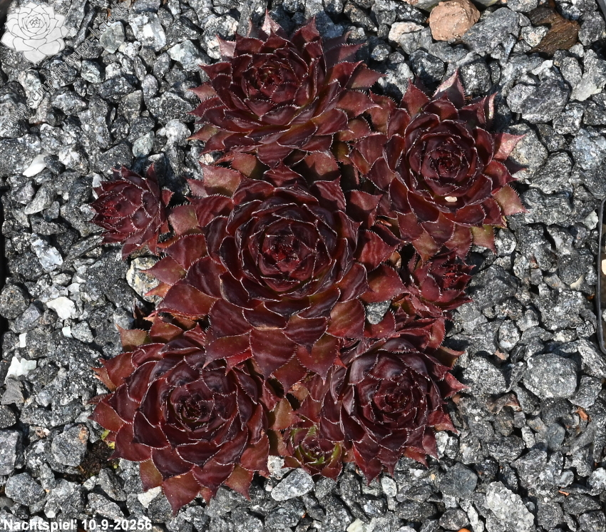 Aufgefallen ist mir der Sämling aufgrund seiner sehr dunklen Frühjahrsfärbung. Die Rosetten besitzen im Frühjahr einen gleichmäßigen, noch dunkleren Farbton als 'Nachtmelodie'. Leider lässt sich die dunkle Farbe nicht auf den Fotos wiedergeben. Von der dunklen Farbe heben sich die leicht weiß bewimperten Blattränder deutlich ab.