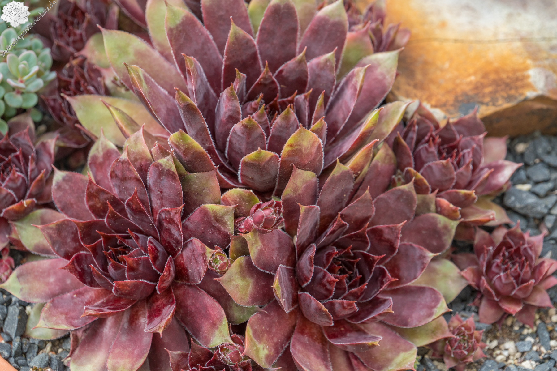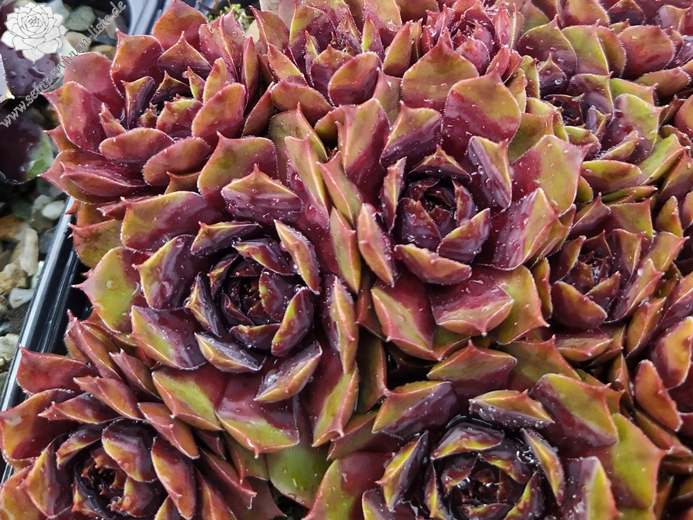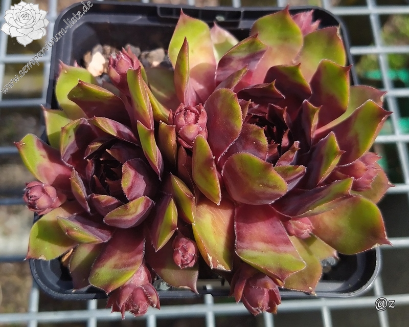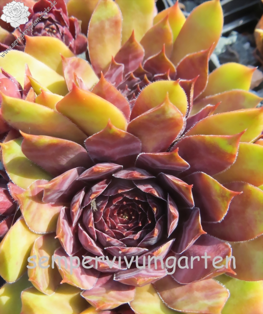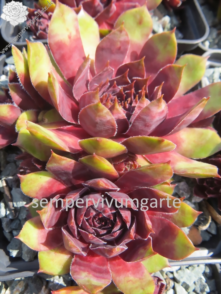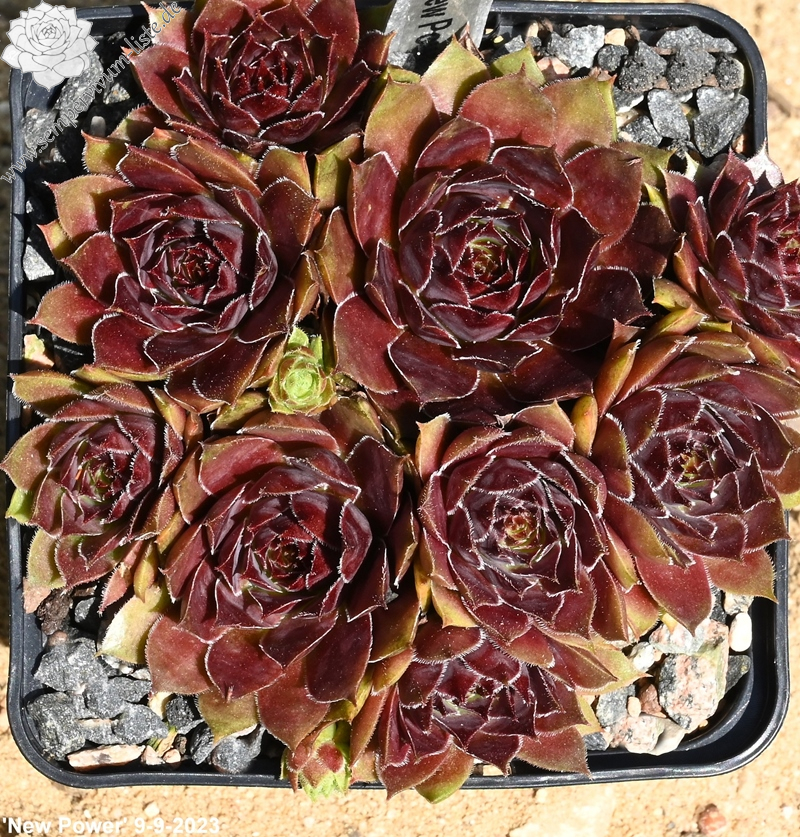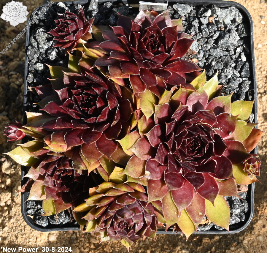 Mit Sempervivum 'New Power' haben wir eine ganz neue, sehr farbenfrohe Züchtung im Sortiment. Die kräftigen Rosetten erreichen einen Durchmesser von 9cm und haben sich als sehr robust gezeigt. Sie sprossen willig und bilden ganz dichte Polster. Besonders in den Sommermonaten fallen die Pflanzen auf. Die Färbung hält sich sehr gut und verträgt auch höhere Temperaturen. Das große, warm rotlila gefärbte Zentrum fällt sofort ins Auge. Die Blattenden besitzen eine helle Färbung und zeigen besonders im Sommer fast gelb/orange Töne. Zu dieser Zeit färben sich die Blattspitzen hellrot und verstärken diese bunte Wirkung. Das Zentrum wirkt metallisch und hat seinen ganz eigenen Reiz.