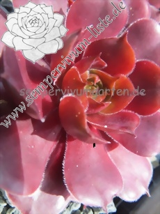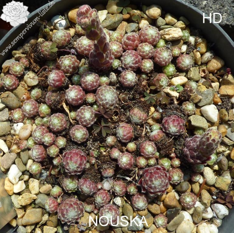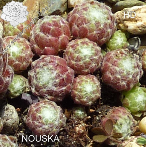 Sempervivum 'Nouska' ist eine ältere Züchtung von André, die ich erst in den letzten Jahren erhalten habe. Sie zeigt auffallend breite Blätter und bringt kräftig rote Farben ins Sortiment. Die Pflanzen erreichen einen Durchmesser von über 9cm und sprossen gut. Eine ganz besondere Pflanze!