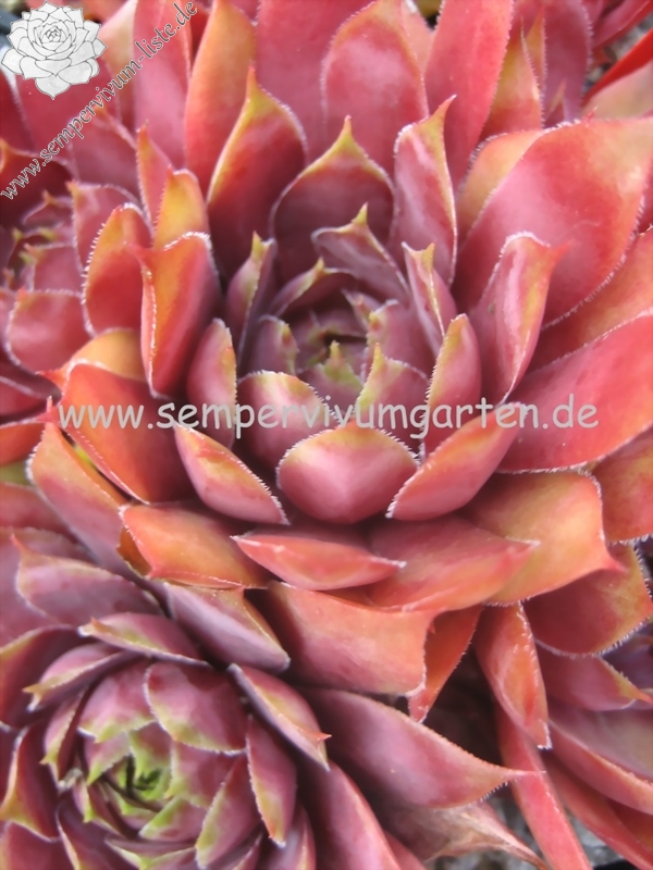 Rosetten bis 7 cm, Blätter oval, lang bespitzt, trübes Rot mit olivgelb