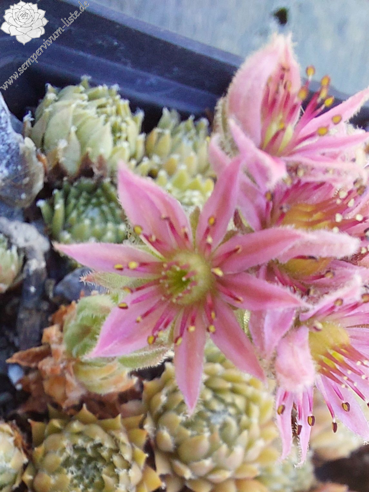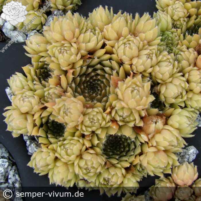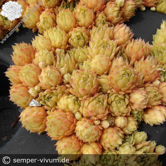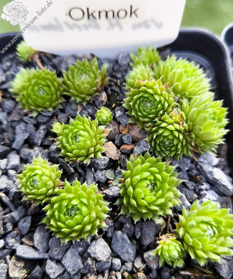 Die Rosetten unseres kleinen Zwergs zeigen je nach Jahreszeit Farben in Beige und Olivgrün mit Apricot im Frühling, zum Sommer auch ein orangegelbes Pastell. Die Spitzen und auch der Rand der Blätter sind fein behaart. 'Okmok' formt sehr kompakte, kleine Hügel und ist sehr gut für die Bepflanzung von Töpfen, kleinen Trögen und vor allem für Arrangements geeignet. Unsere Auslese erinnert in Wuchs und Rosettenform und auch von der Größe an die beliebte S. x barbulatum Sorte 'Hookeri'. Ihre Färbung ist aber sehr unterschiedlich. Es ist ein Sämling von 'Little Miss Sunshine', den wir nach dem Mount Okmok dem höchsten Punkt des Randes der Okmok Caldera auf dem nordöstlichen Teil von Umnak in den östlichen Aleuten in Alaska benannt haben (Quelle: Wikipedia).