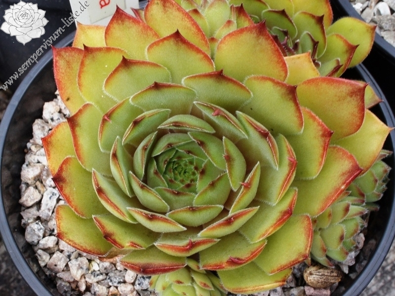 Die neue Sorte aus Belgien formt recht runde Rosetten in olivgrüner Grundtönung. Zum Frühjahr mischen sich orange und braune Töne unter. Dann zeigen die Spitzen der relativ breiten, leicht behaarten Blätter eine rotbraune Farbe.