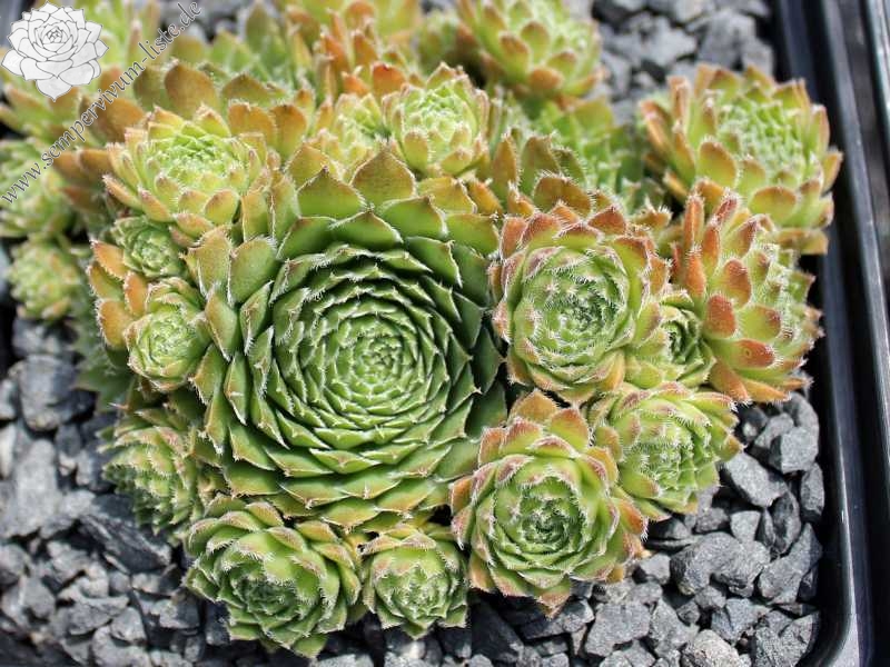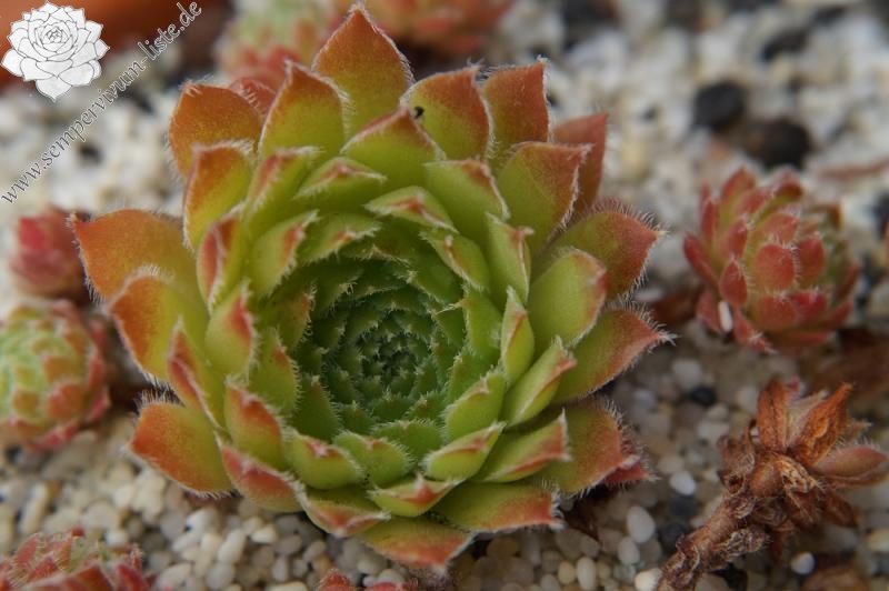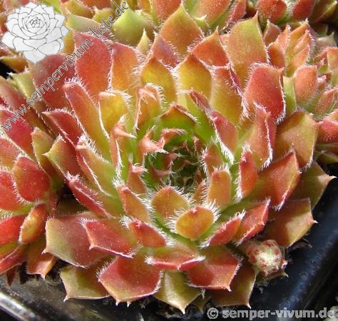 Der Sämling von S. arachnoideum 'Wolllaus' formt etwa drei bis vier Zentimeter große Rosetten - im Frühjahr bis Sommer mit auffallend oranger Färbung. Das Zentrum leuchtet in pistazienfarbenem Grün. Besonders kontrastreich sind die langen Haare am Blattrand, wodurch die Rosetten einen frostigen Eindruck gewinnen. Unsere neue Auslese ist sehr wüchsig und freut sich auf rege Verbreitung.