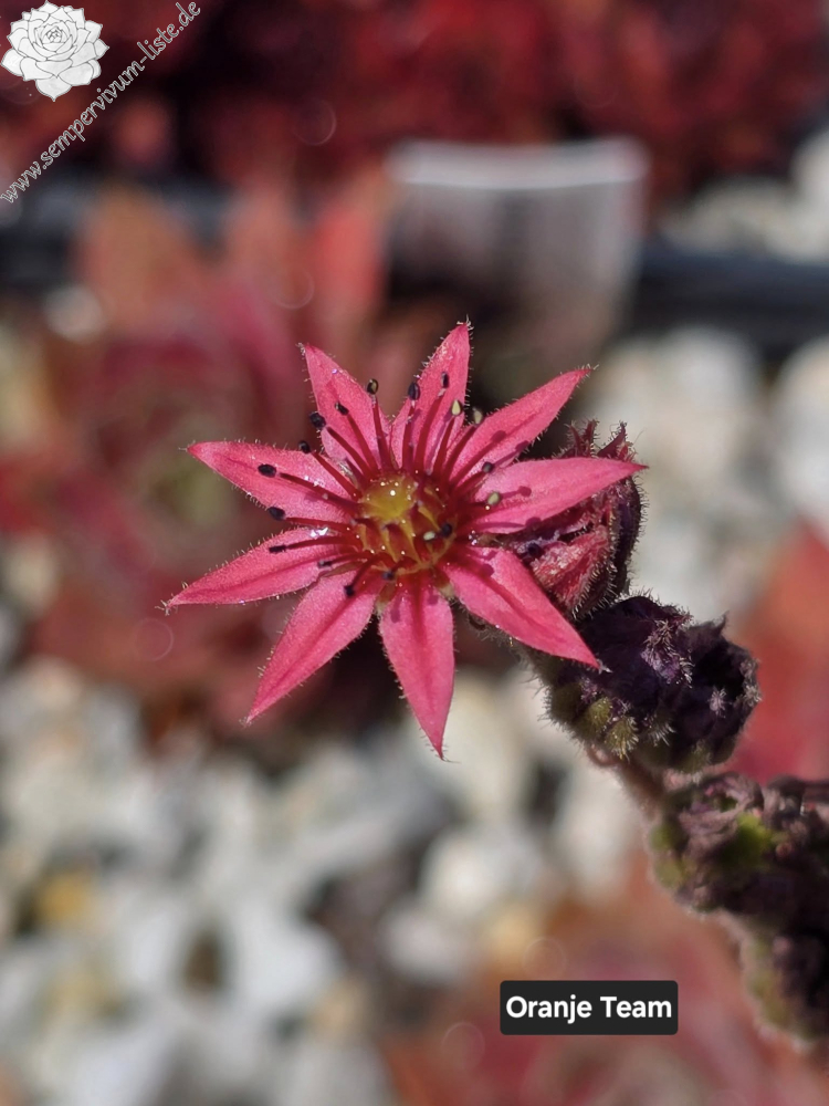 Sempervivum 'Oranje Team' ist ein kräftig rot gefärbter Spinnweb-Hauswurz. Das Zentrum ist gut besponnen und die Blattenden sind weiß behaart. Eine wirklich tolle Pflanze, die reich sprosst und ganz dichte Polster bildet.