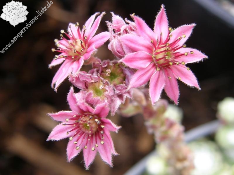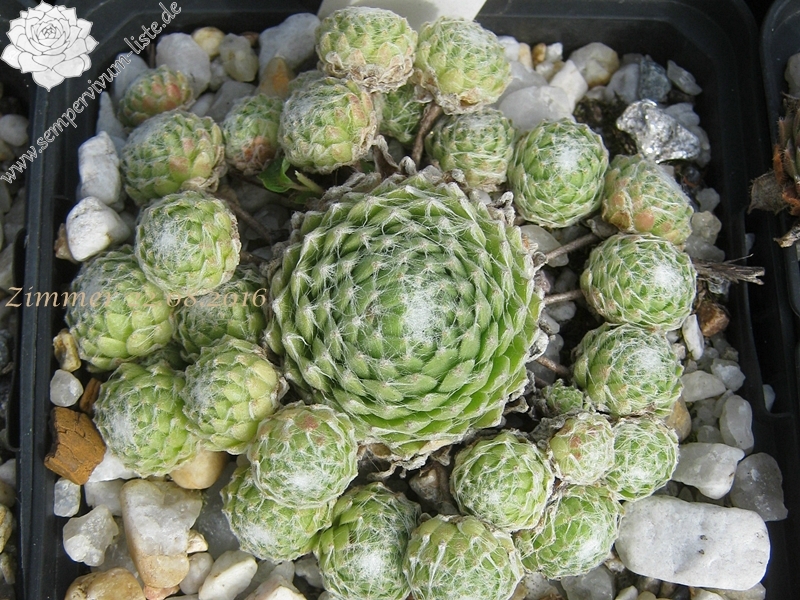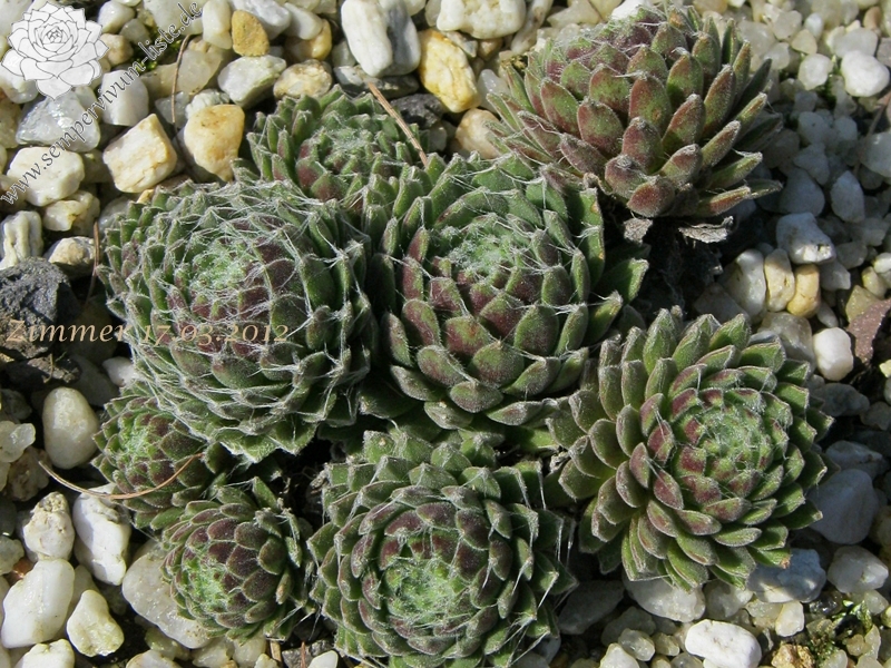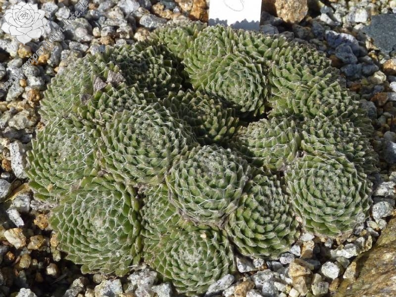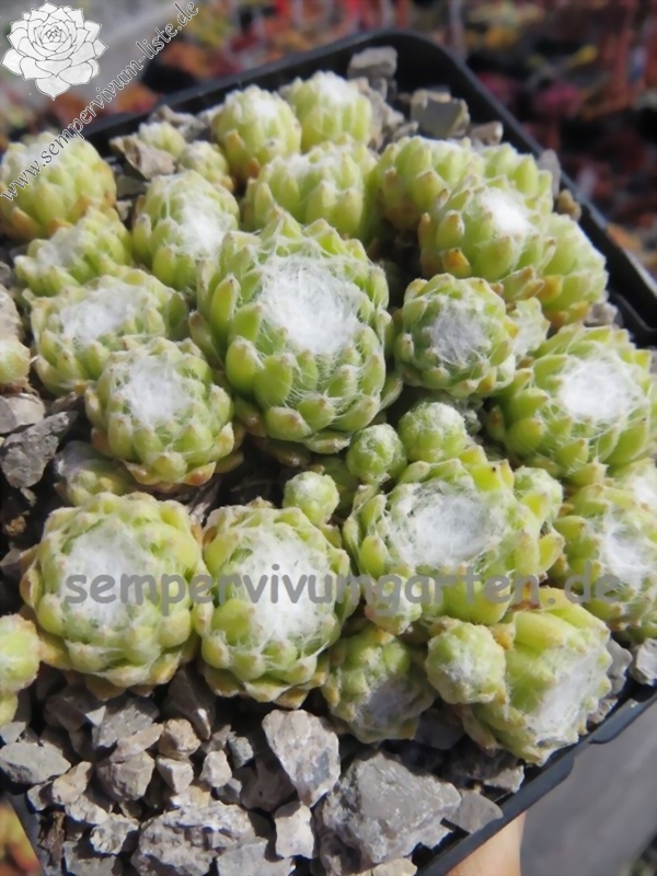 Mit Sempervivum 'Osorno' haben wir einen kleinen Spinnweb-Typen, der lockere Polster bildet. Das Zentrum ist dicht weiß besponnen und durch die hellgrüne Färbung der Blätter entsteht ein sehr kühles Bild.