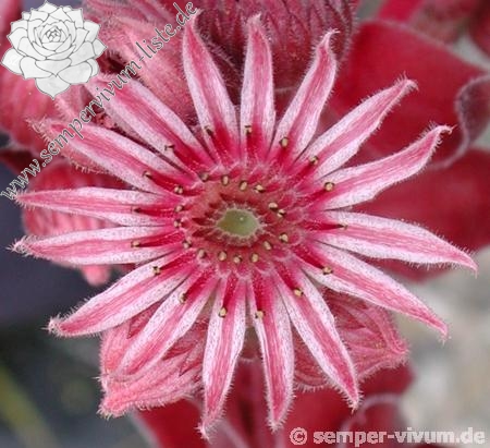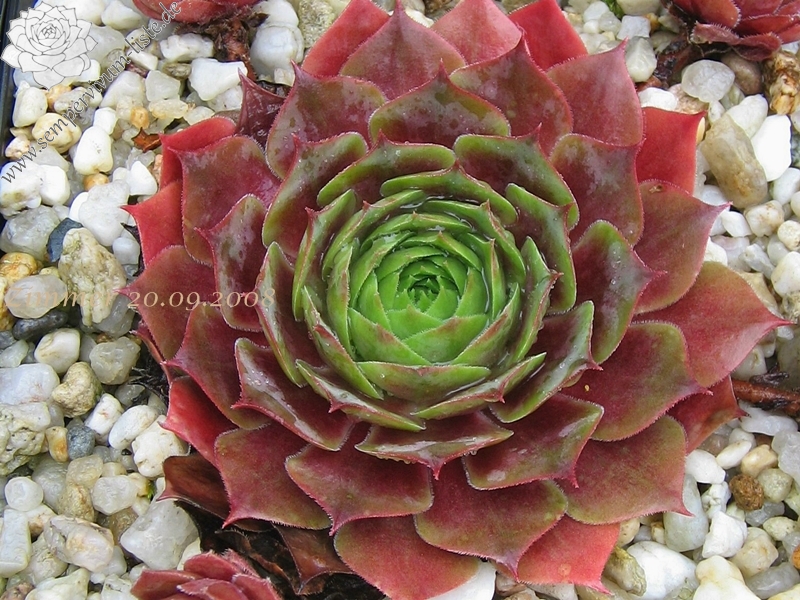 Weit verbreitete großrosettige S. marmoreum Hybride, die Ende der 50er Jahre aus 250 Sämlingen im Sichtungsgarten in Weihenstephan ausgelesen wurde. Meines Erachtens immer noch die schönste rote Sorte dieser Größe. Schön geformte, bis zu 16 cm große Rosetten, wüchsig und robust!