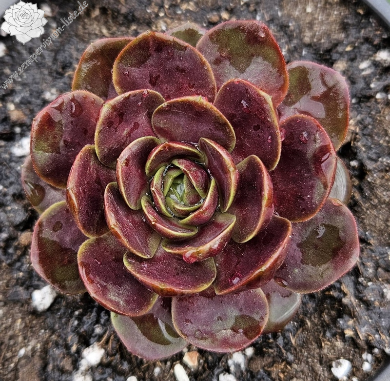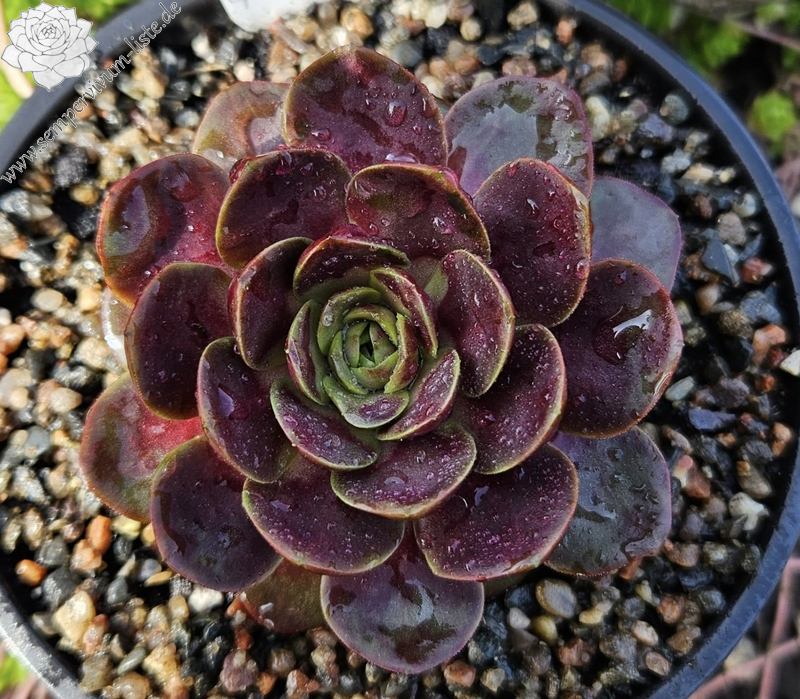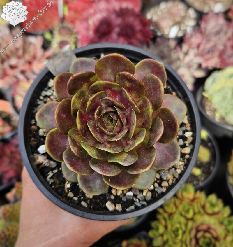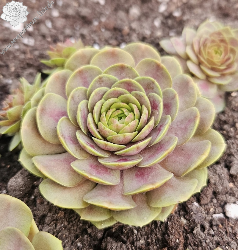 'Pandora's Tenderness' - bildet mittelgroße, robuste Rosetten mit sehr saftigen, runden Blättern, die einen Durchmesser von etwa 8 cm erreichen. Im Frühling sind die Rosetten kirschrot. Im Sommer hellt sich die Farbe zu Beige und Beigegrün auf, wobei diffuse rötliche Flecken auf den Blättern zurückbleiben. Die äußeren Blätter öffnen sich fächerförmig und liegen fast flach auf dem Boden. Die Auswahl von Julia Gusakowa 2022