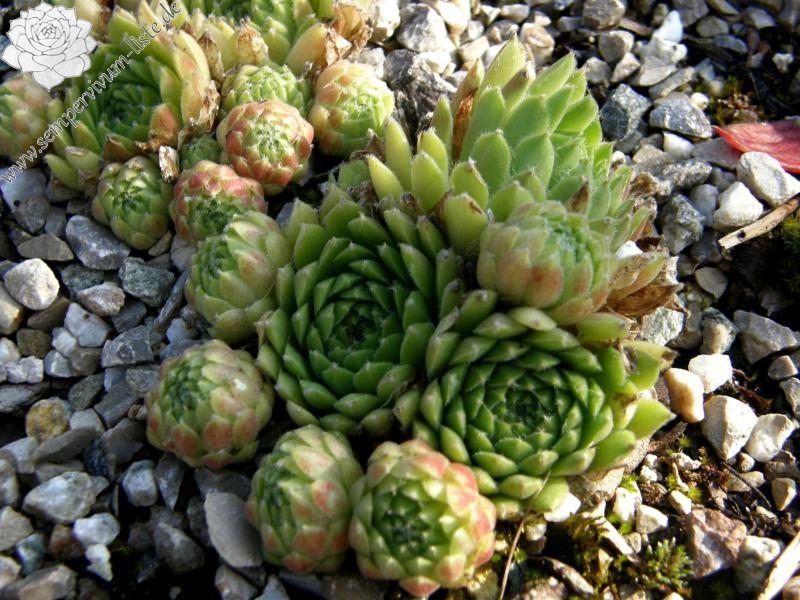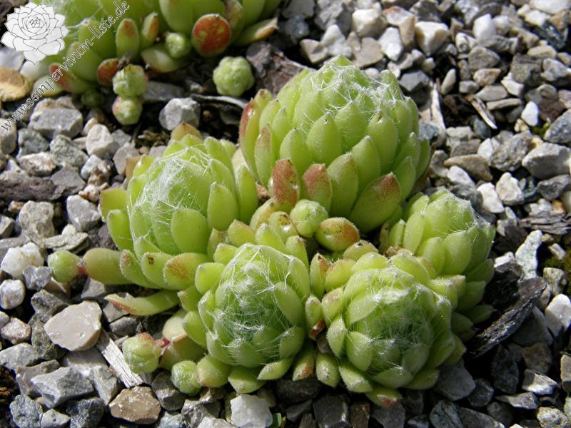 kleine Rosetten licht - oder cremegrün, im Frühling rot überhaucht, auf den Blattspitzen leichte Haarbüschel, wünscht einen etwas nahrhaften Boden
