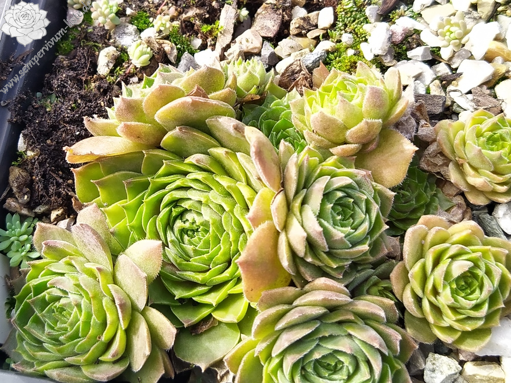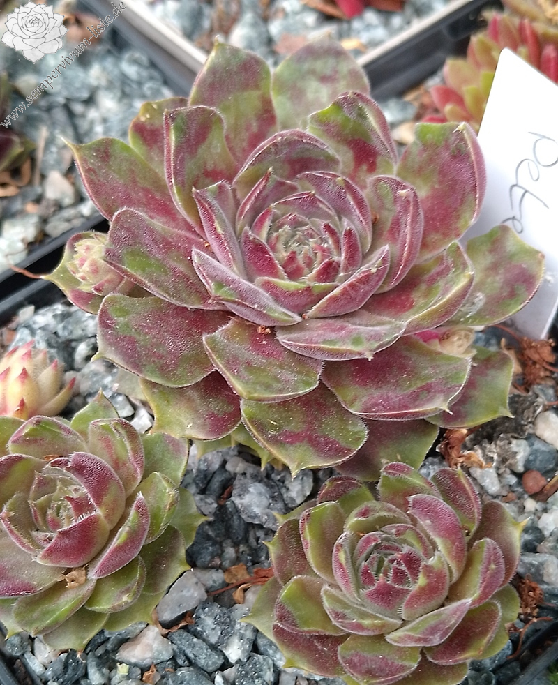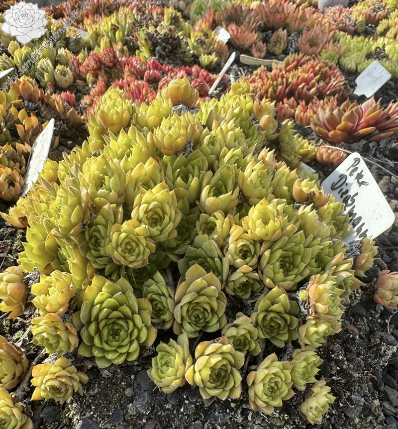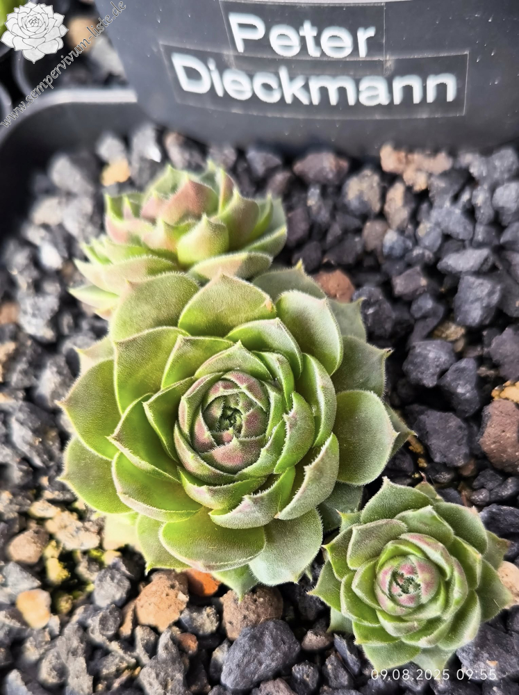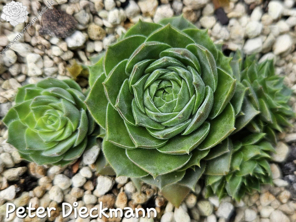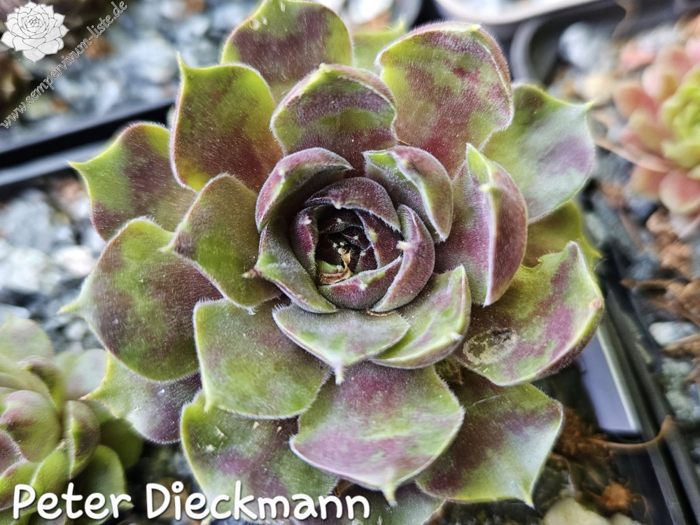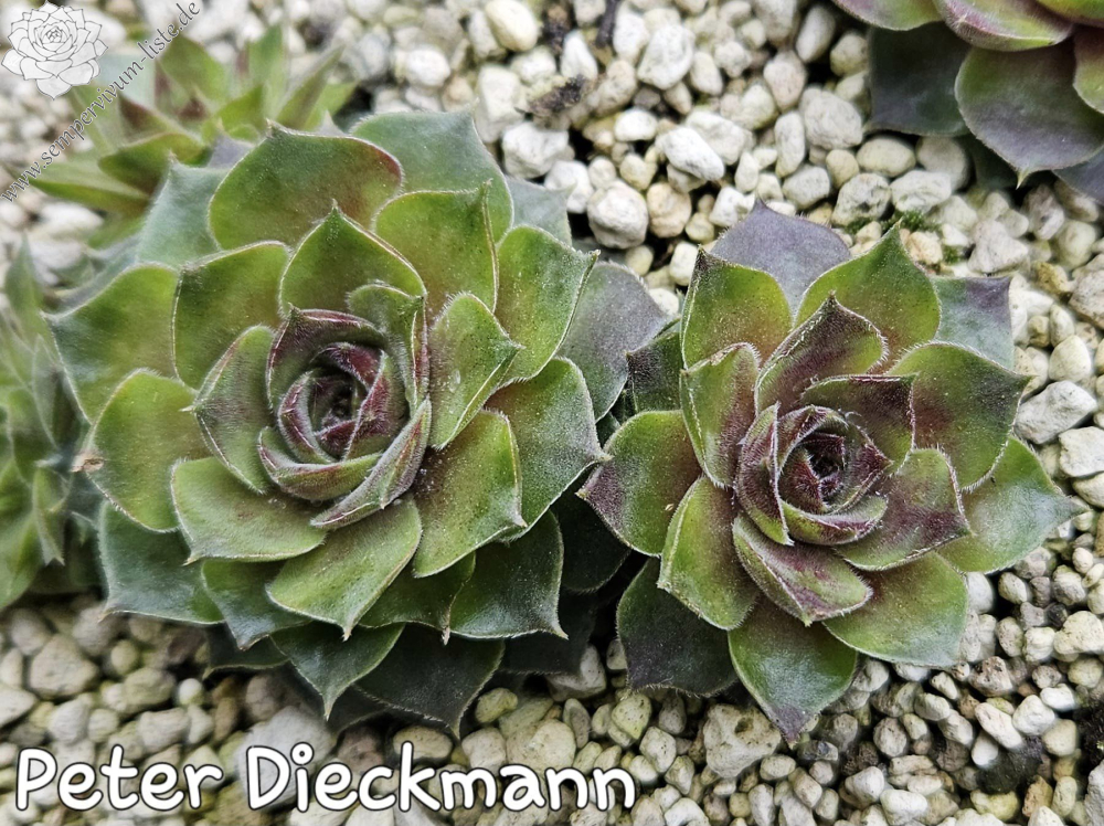 Anlässlich unseres 10 jährigen Jubiläums der Sempervivum-Liste stellte ich eine neue Sempervivumsorte vor. Es handelt sich um einen Sämling von 'Cleveland Morgan' aus einer Absaat von 2011. Der Vater ist unbekannt. Dieser Sämling gefällt im Frühjahr dank seiner samtigen Blattoberfläche und dem rauchigen Violett. Zur Besonderheit wird er später, wenn in den Sommermonaten sich die Blattränder mehr und mehr zu wellen beginnen und die Pflanze dadurch ein "gerüschtes" Aussehen erhält. Das Violett hat sich in dieser Zeit in einen schönen Grünton verwandelt, die Blattoberfläche der "Sommerform" ist glatt. Die Rosetten werden - je nach Alter und Substrat - bis zu vier Zentimeter groß. Die Sorte ist gesund und wüchsig. Benannt habe ich sie nach unserem, leider verstorbenen, lieben Freund, Mitbegründer und Hauptadmin der Sempervivum-Liste, Peter Dieckmann. 'Peter Dieckmann' zeigt im Laufe einer Wachstumsperiode also zwei völlig unterschiedliche Formen und es ist sehr interessant, diese Veränderungen jedes Jahr aufs Neue zu erleben.