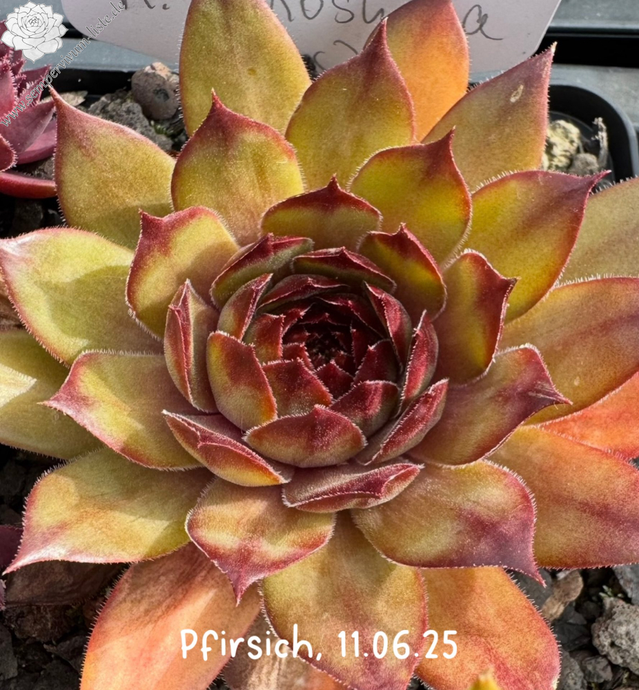 Mittelgroße Rosetten, behaart, mit einem Rand am Blattrand, erhalten im Sommer allmählich einen warmen pfirsichfarbenen Farbton. Die Eltern sind unbekannt.