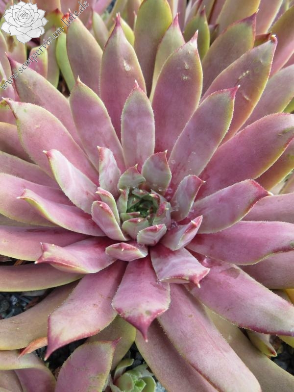 Sempervivum 'Pink Infinity' ist ein großer, pinkfarbener Hauswurz. Die großen Rosetten besitzen ganz lang gestreckte Blätter. Im zeitigen Frühjahr zeigen die kühl gefärbten Pflanzen einen leichten Hauch lilaner Farbe. Die Blattspitzen sind dunkelrot gefärbt und heben sich deutlich ab. Die Blätter stehen fast senkrecht nach oben. Größere Polster besitzen im Frühjahr eine ganz spezielle Wirkung. Sobald die Temperaturen steigen, verblassen die Blattspitzen und die Rosettenfärbung wird viel intensiver und präsentiert pinke Farbtöne. Im Sommer werden die Rosettenblätter viel kompakter und besitzen eine ganz feste Wirkung. 'Pink Infinity' ist eine anspruchslose Pflanze, die ganzjährig gut aussieht und willig sprosst. In jeden Topf sind meist drei Einzelrosetten enthalten, diese sollte man am besten gleich nach Erhalt auseinander nehmen und einzeln pflanzen. Am schönsten entwickeln sich Einzelrosetten, die nach und nach schöne, neue Polster aufbauen.