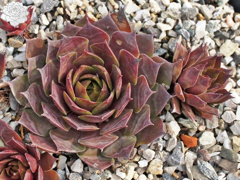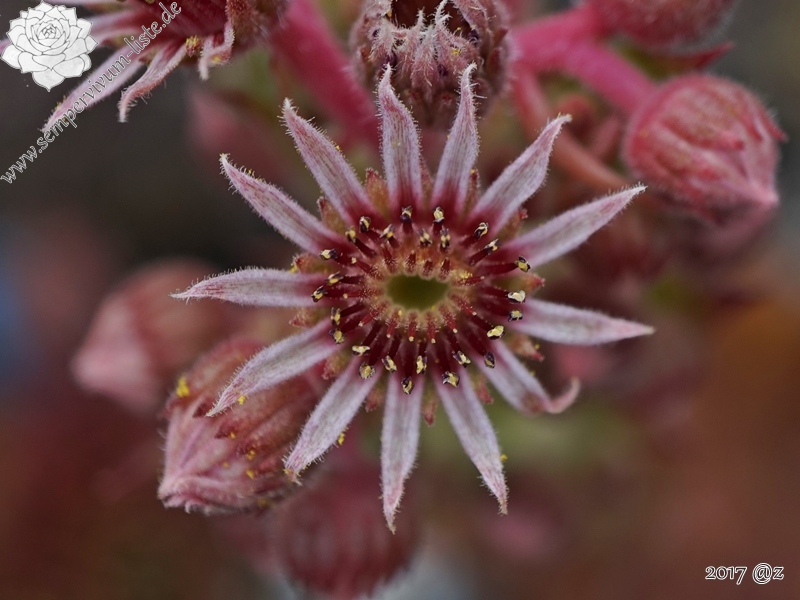 Sempervivum 'Pink Pashka' ist eine große Pflanze, mit auffallend langen Blättern. Die Pflanzen besitzen eine ganz ausgefallene Färbung. Im Zentrum zeigt sich zudem ein rosa Hauch, den man leider am Foto nicht richtig erkennen kann.