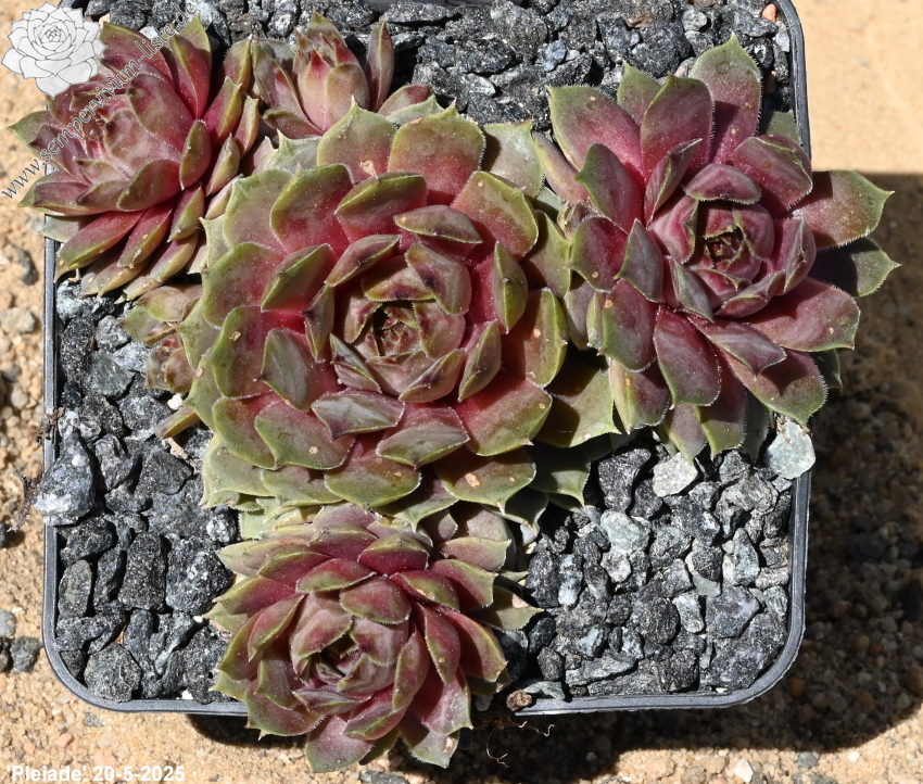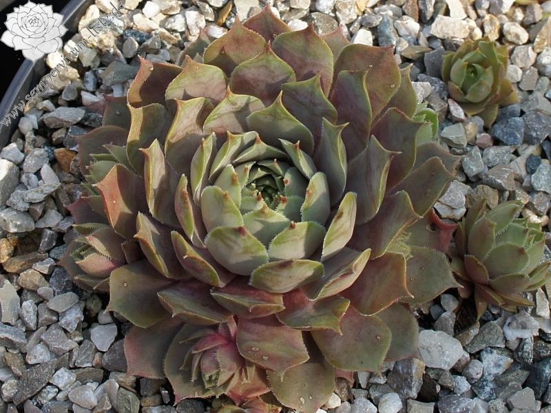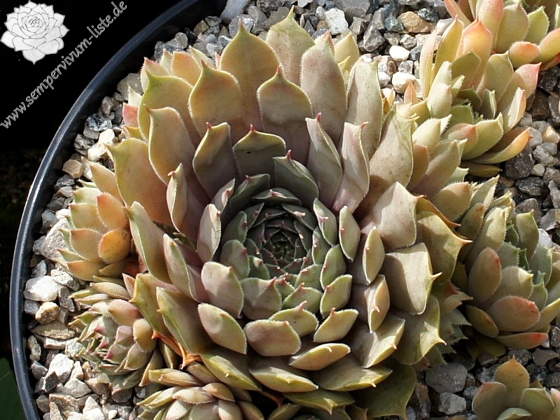 Diese Sorte besticht durch ihre deutlich aufgesetzten Blattspitzen. Die größeren Rosetten zeigen während des Jahres verschiedenste Farbschattierungen in Altrosa und Olivgrün.