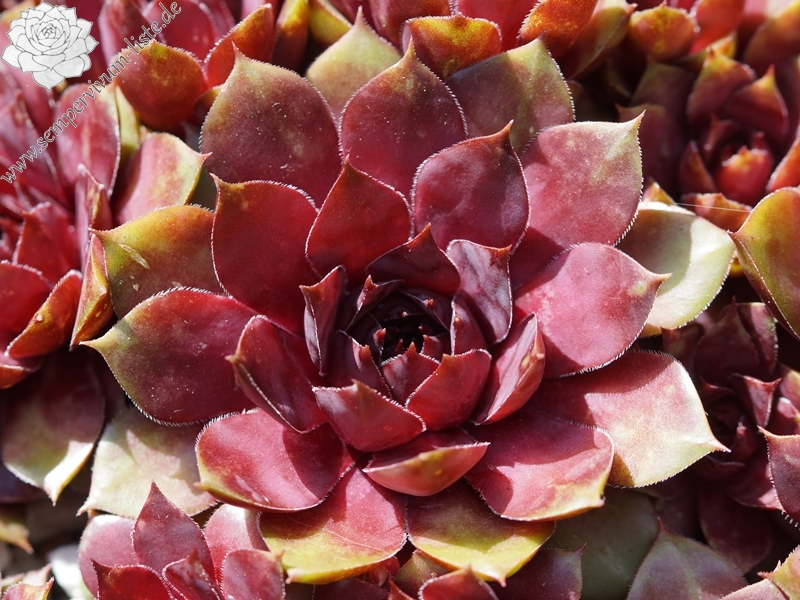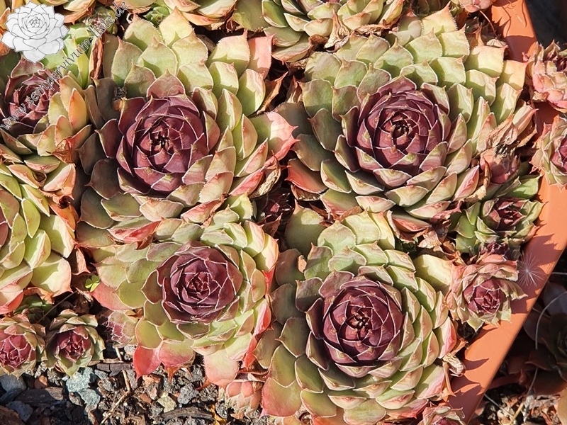 Im September ist bei den Rosetten nur noch das Herz purpurfarben, die äußeren Blätter sind dann beige bis hellgrün gefärbt, mit einer leichten Marmorierung, die die Dornen betont.