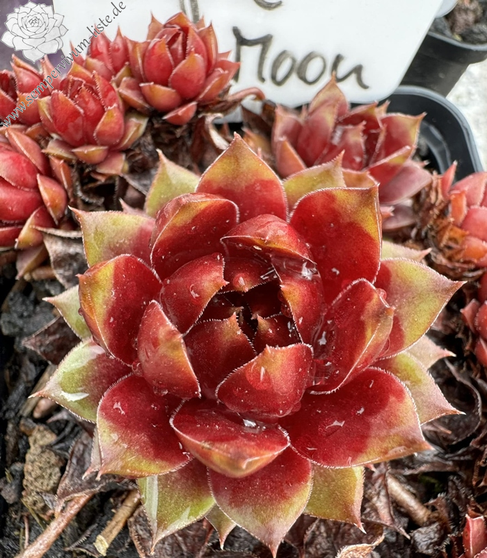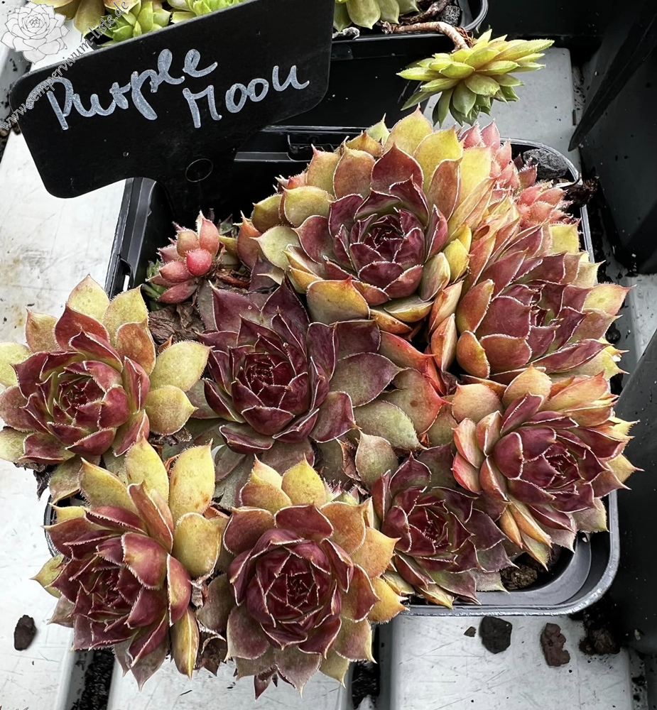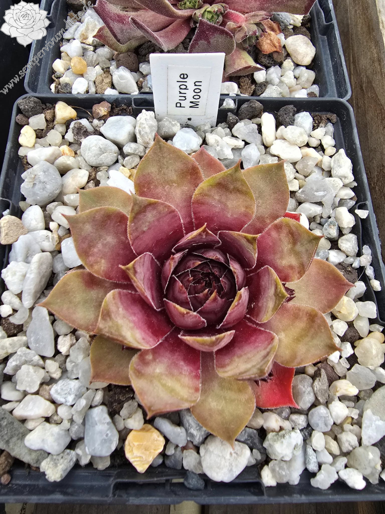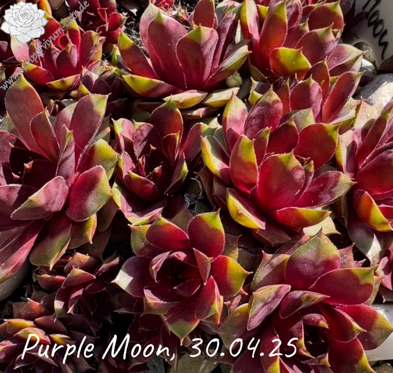 'Purple Moon' bildet mittelgroße Rosetten mit ca. 5-6 cm Durchmesser und einem kompakteren, pupurfarbenen Herz. Im Mai sind die mittleren Blätter an den Spitzen zum Teil etwas bläulich marmoriert. Nach außen hellen die Blattspitzen immer mehr auf, bis die äußerste Blattreihe goldgelbe Farben zeigt, die sich zur Basis hin langsam mit Purpur vermischen.