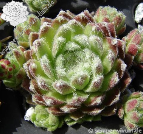 Es ist ein kugeliger Typ mit samtenem und stark weiß behaartem Laub. An den Blattenden sitzen dichte weiße Büschel. Die Rosetten sind etwas größer als bei den meisten anderen Spinnwebhauswurzen.